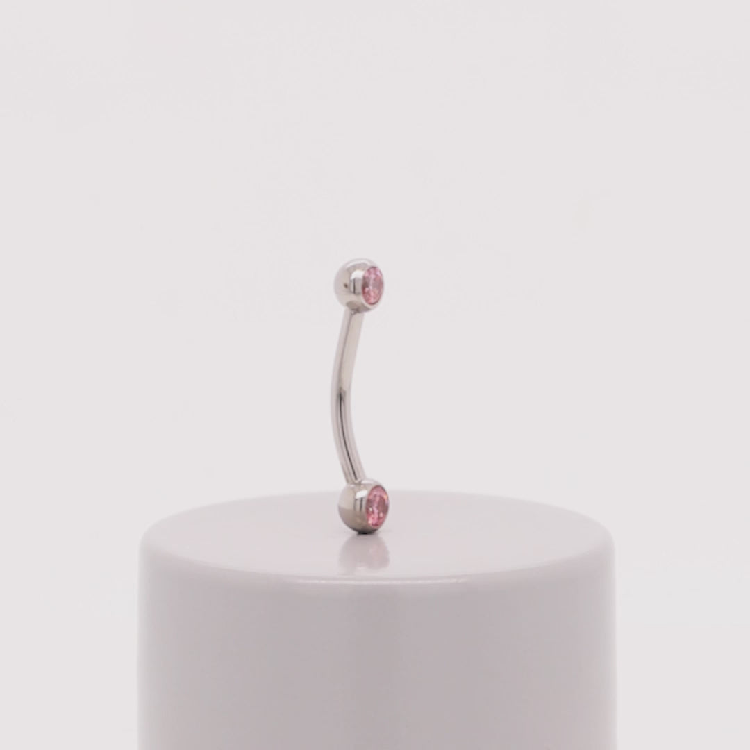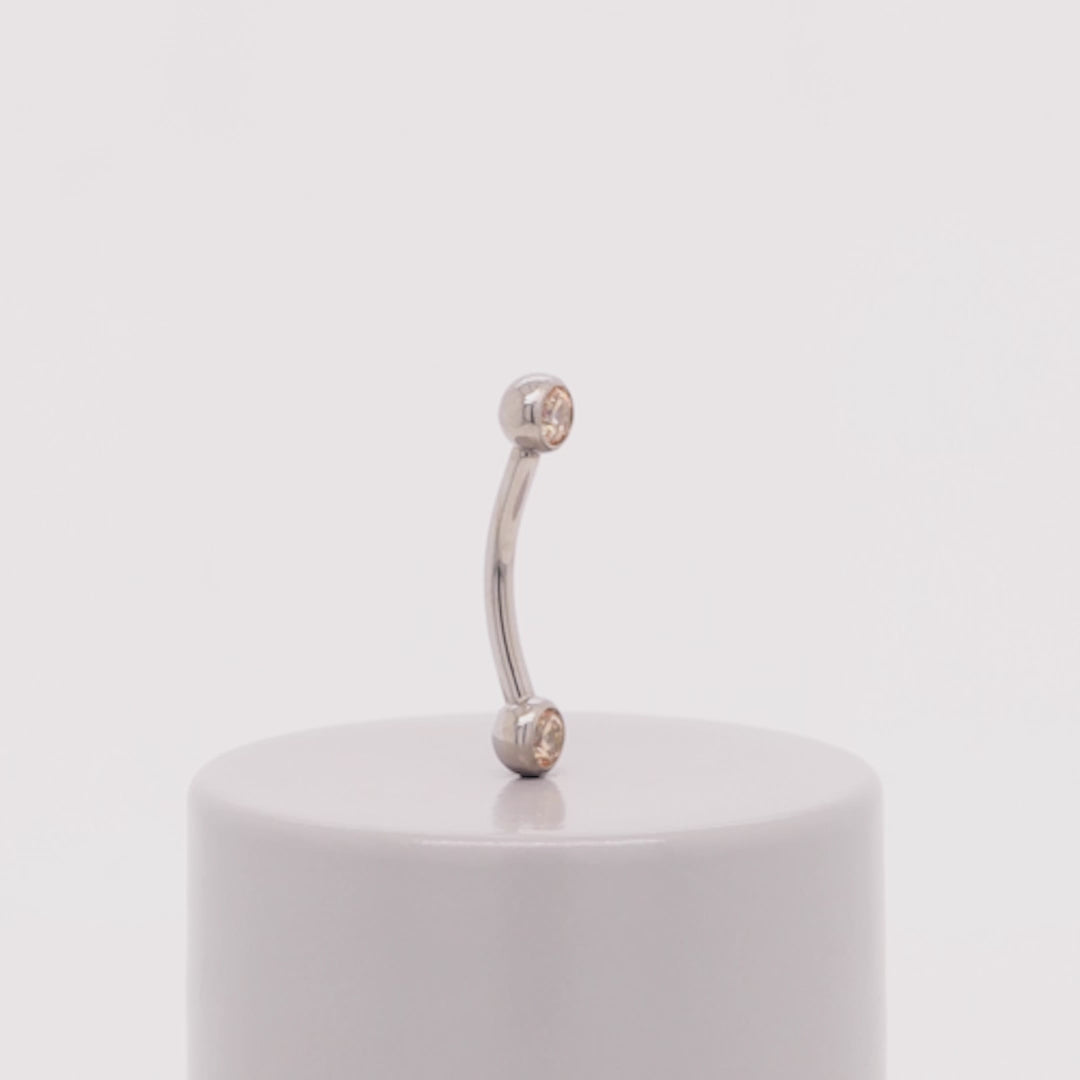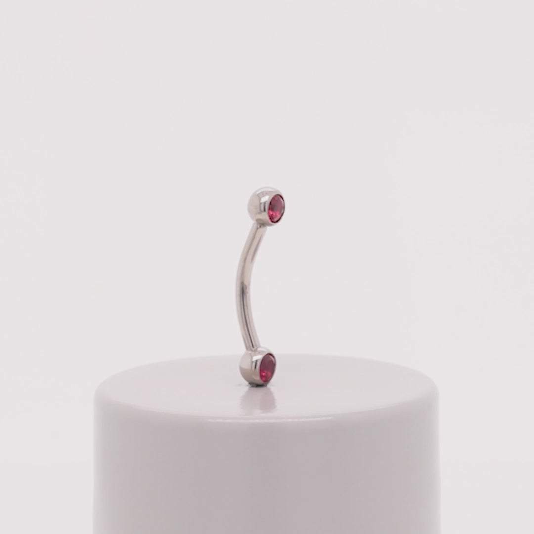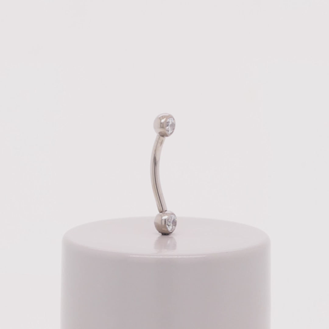 | Double 2mm forward facing gems on threadless push pin curved barbell. One gem end is fixed, only one end is removable, this comes as a whole piece assembled. |