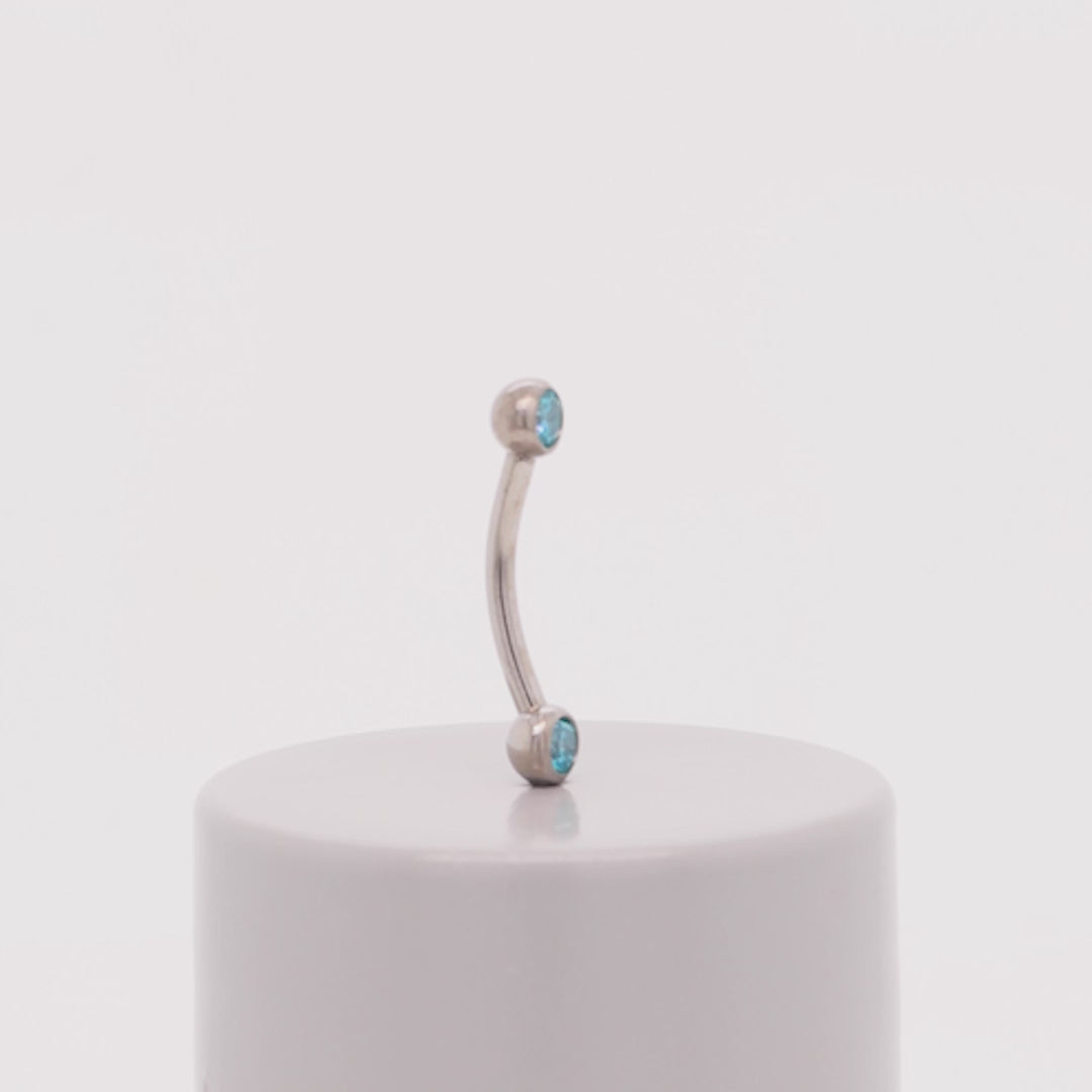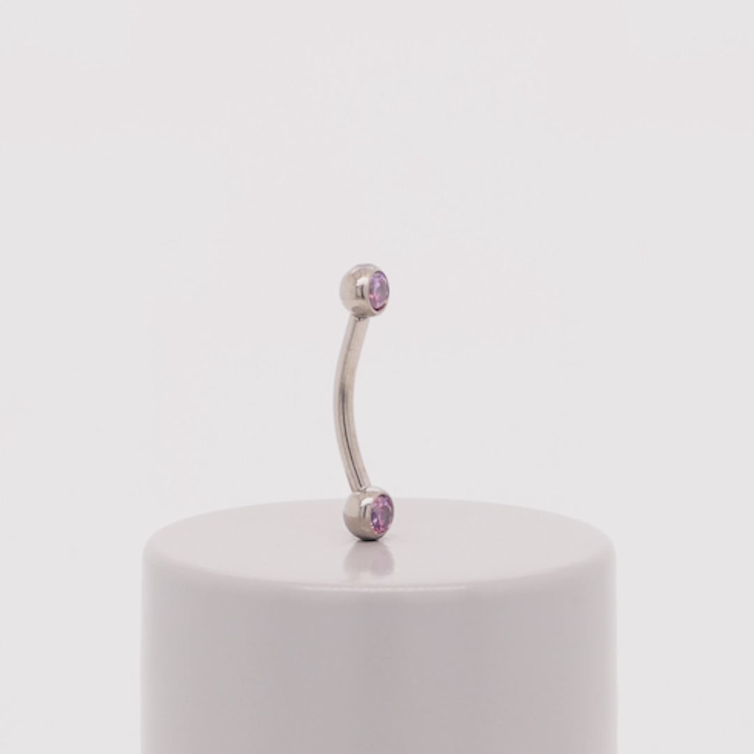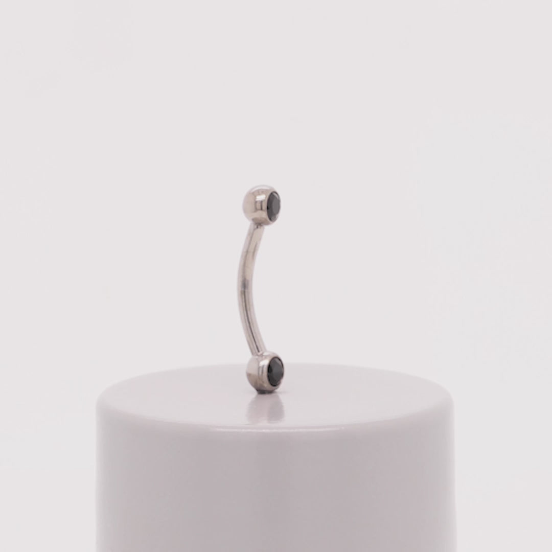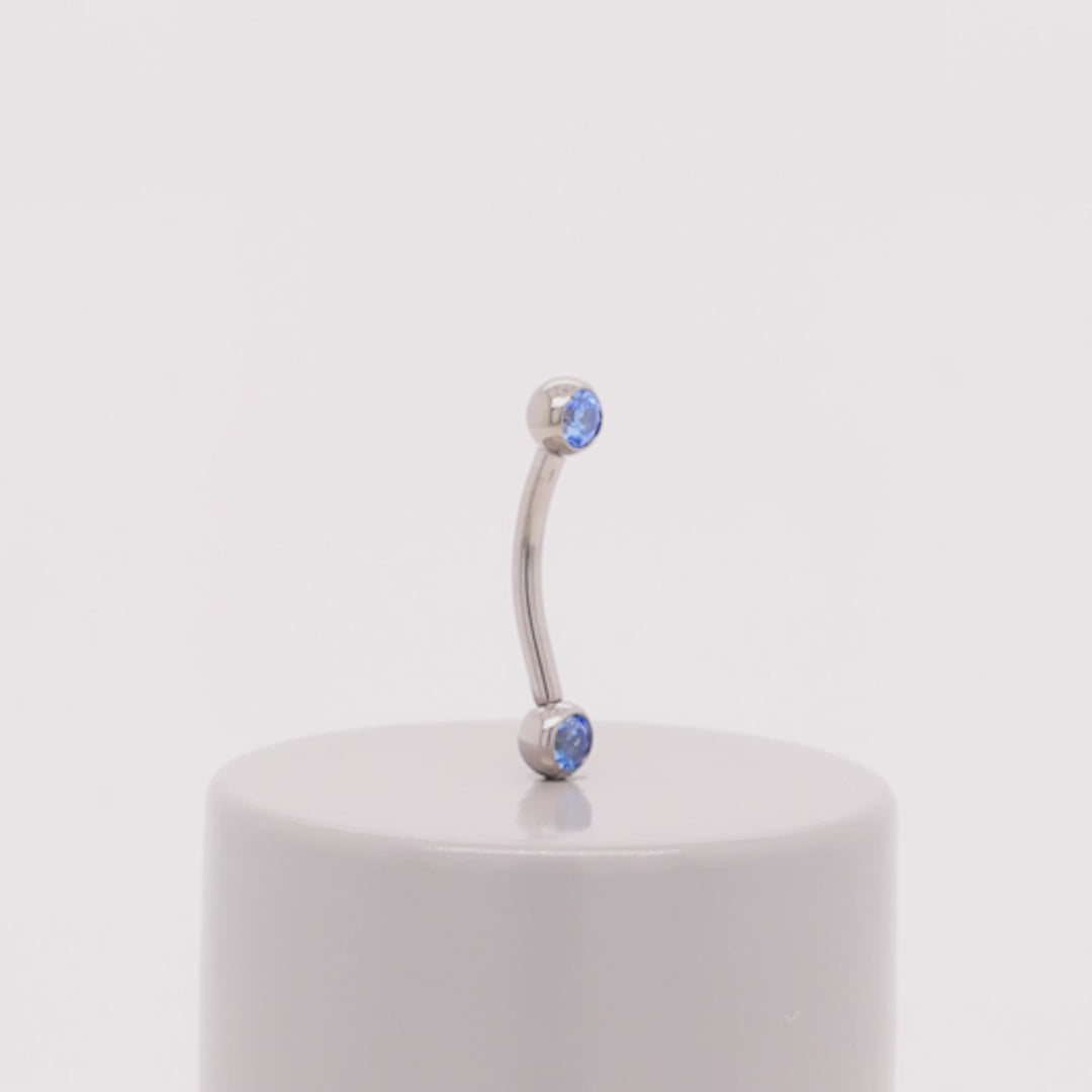 | Double 2mm forward facing gems on threadless push pin curved barbell. One gem end is fixed, only one end is removable, this comes as a whole piece assembled. |