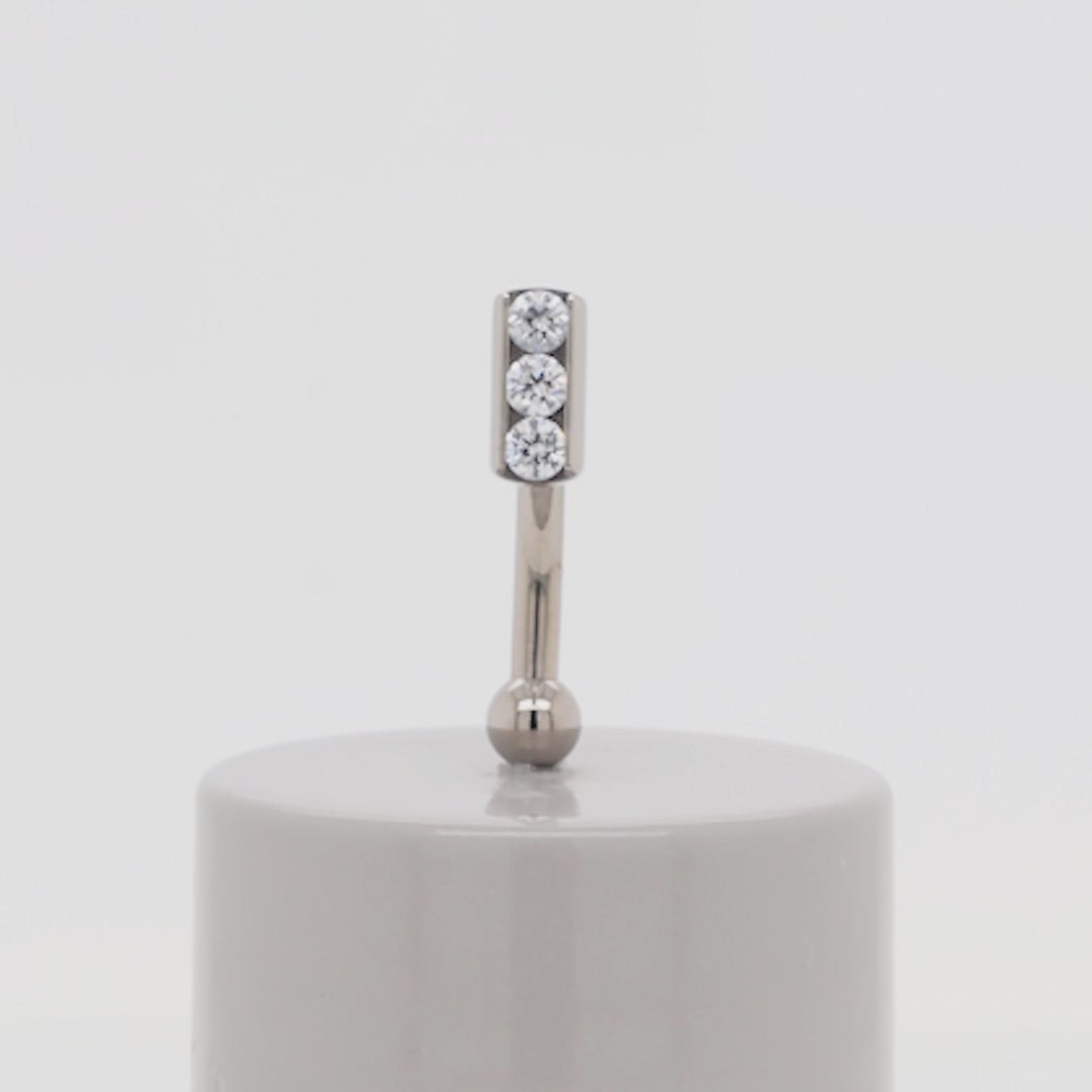 Titanium Channel Set Top Down Navel Curve with 3 gems and a 1/8" ball on bottom. The size of the top group of gems is 3mm x 6.5mm.
