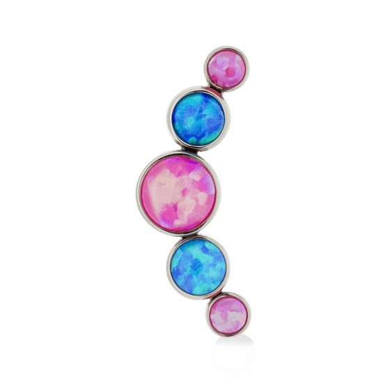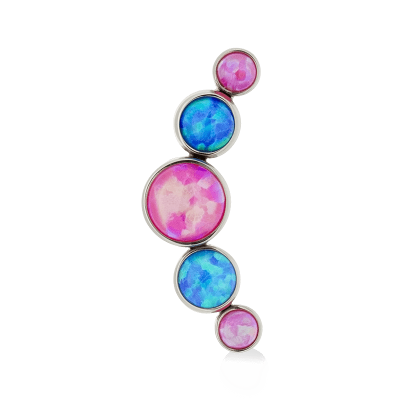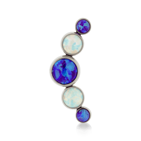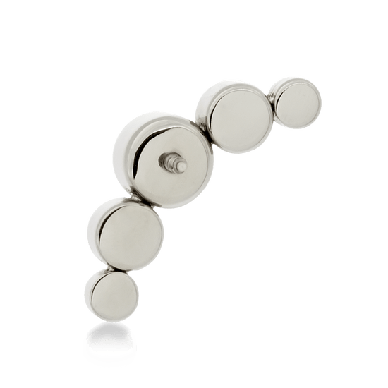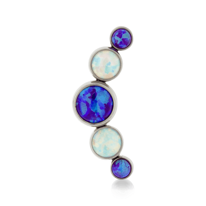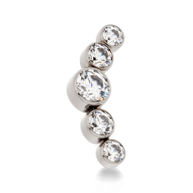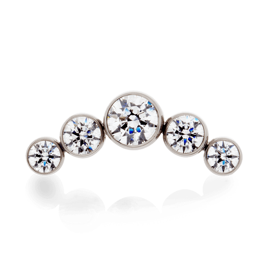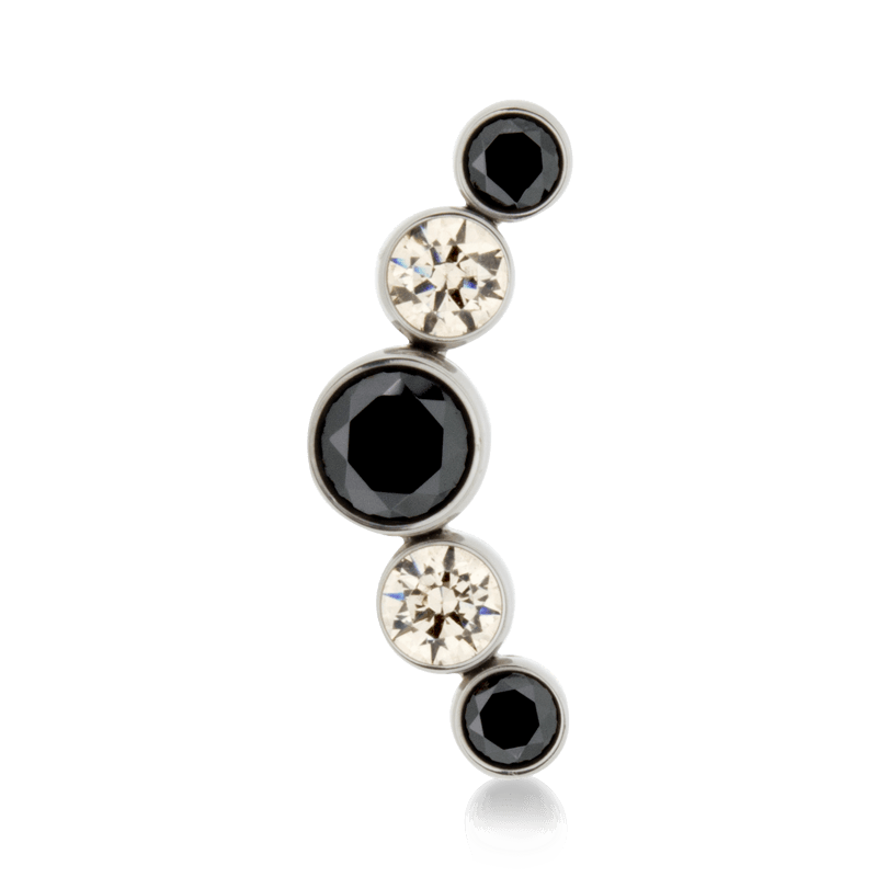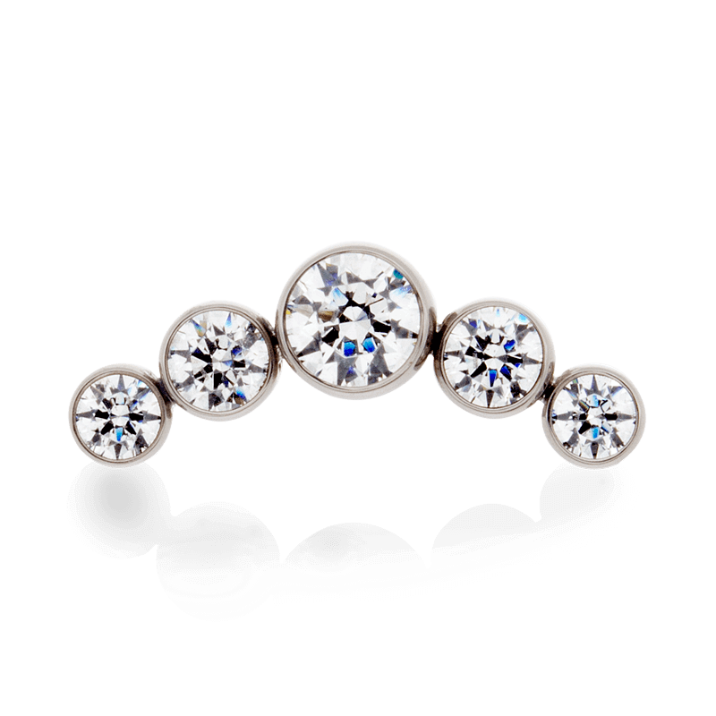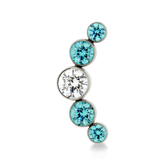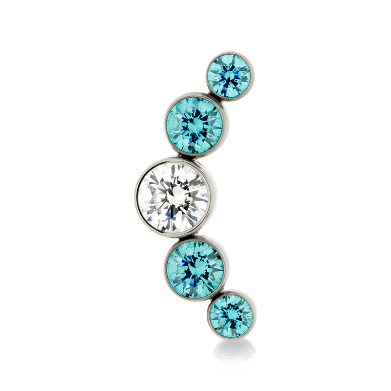 Size: 4mm Center, 3mm on either side, 2.5mm on ends (6.4mm x 16.8mm) Material: F136 Implant Grade Titanium Gemstone cut: Faceted Round |