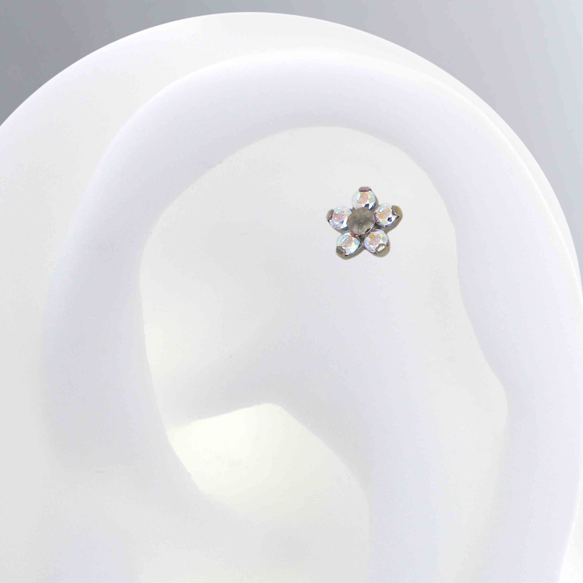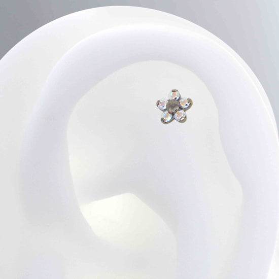 How about a flower to sparkle up your ear! If you want something a little larger than a single stone, but want to keep the profile of your earring low, this piece is perfect. Since it combines 5 small gemstones you get that extra shine without the bulk of a single large stone!