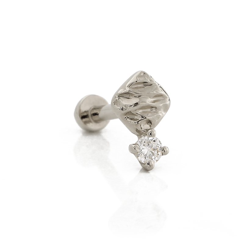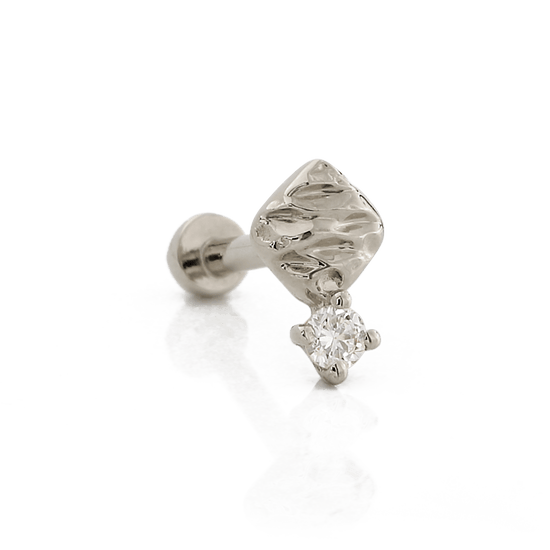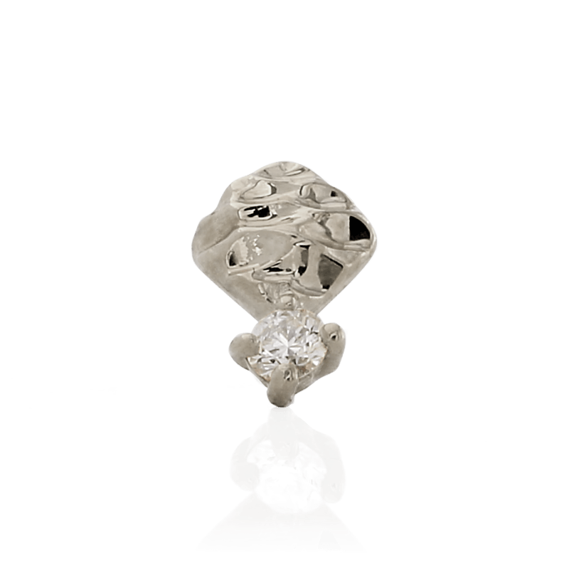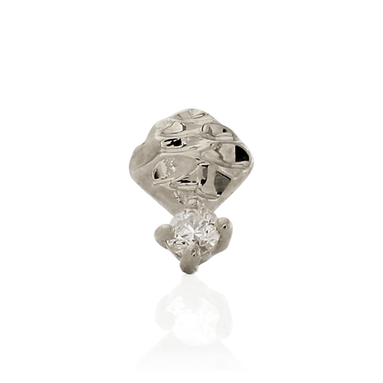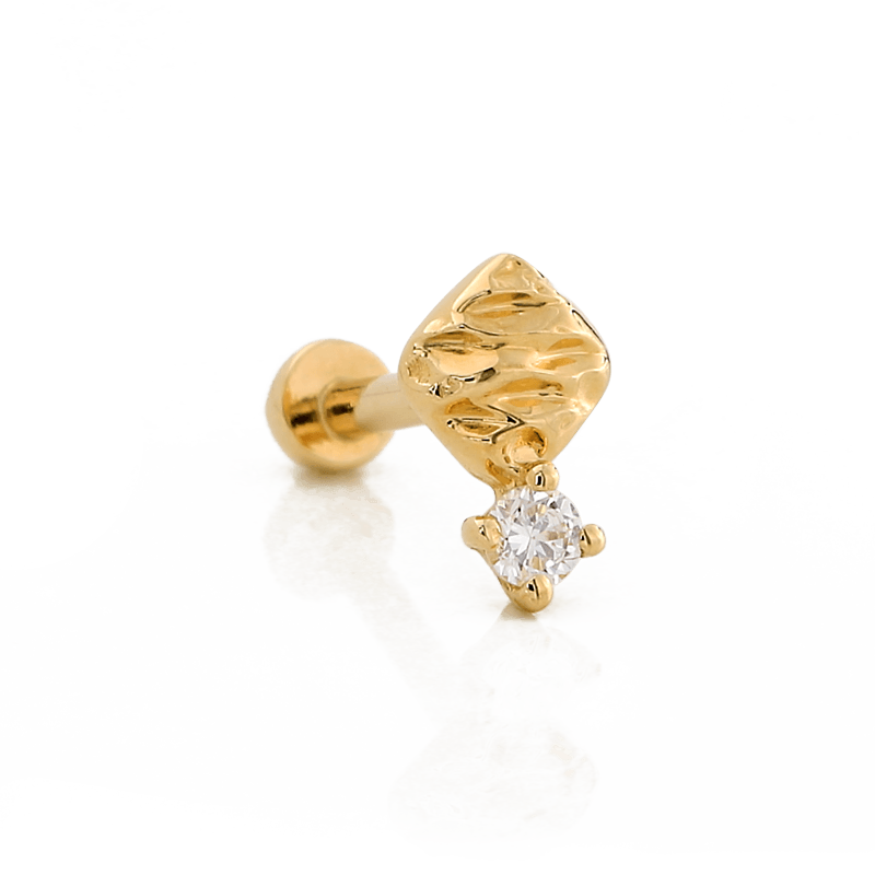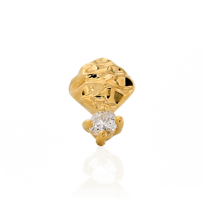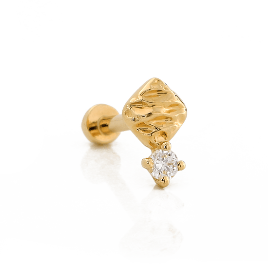 14k Solid gold Cushion Diamond is a textured shape paired with a single round Diamond.