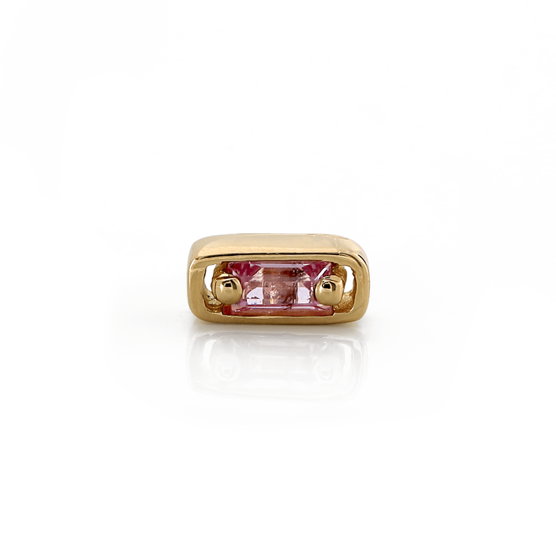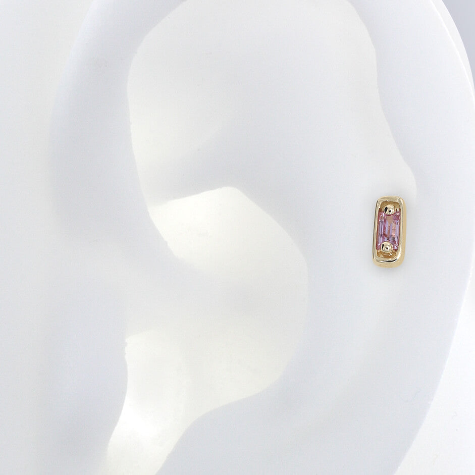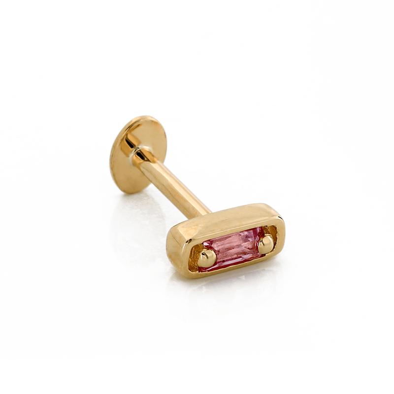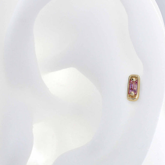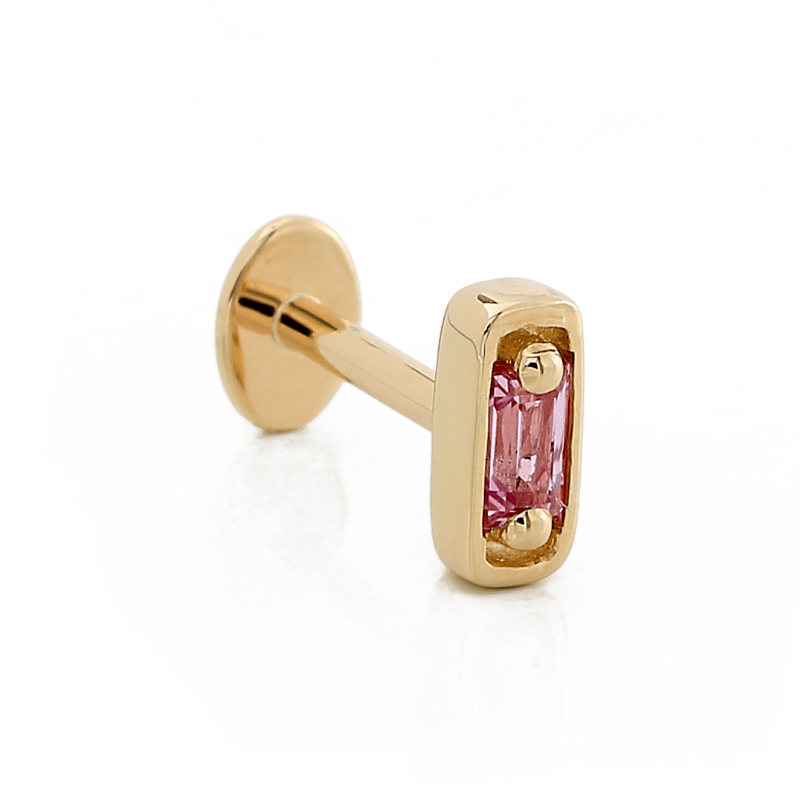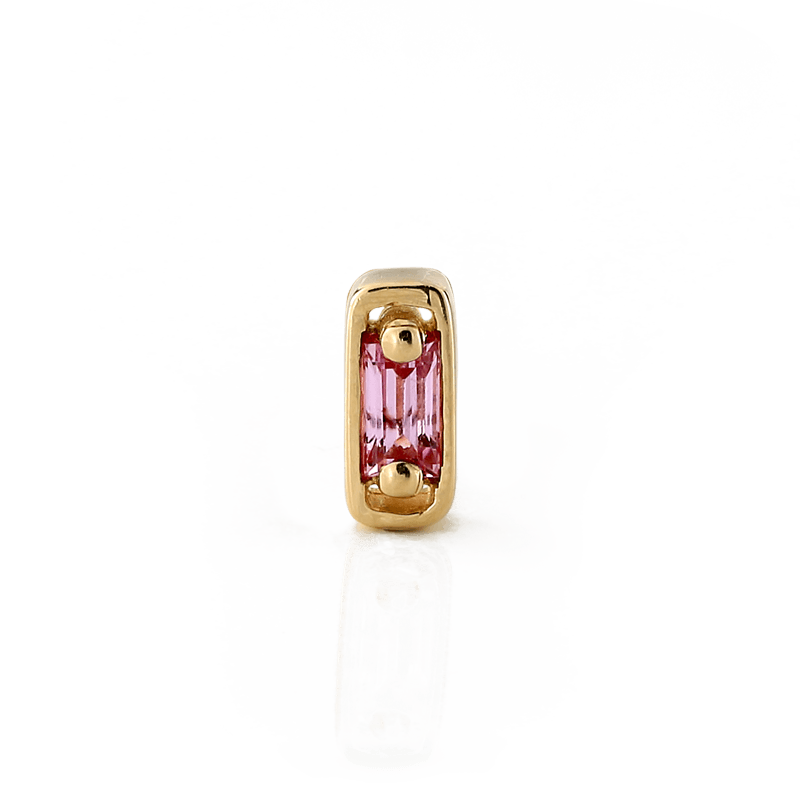Size: 2.5mm x 5.5mm Material: 14k Gold Gemstone cut: Baguette Pink Sapphire |