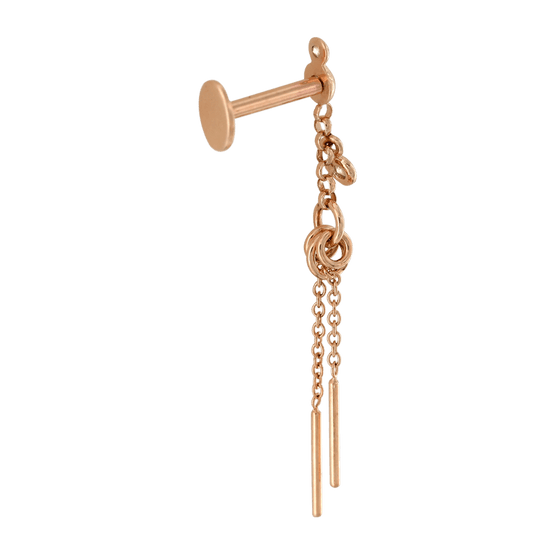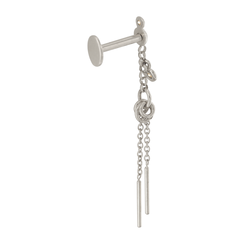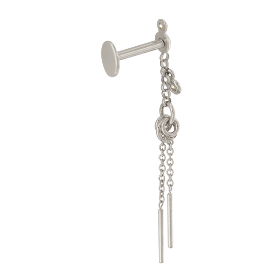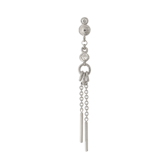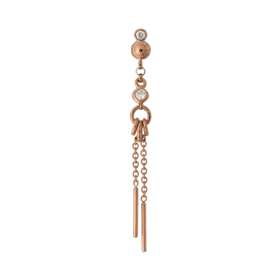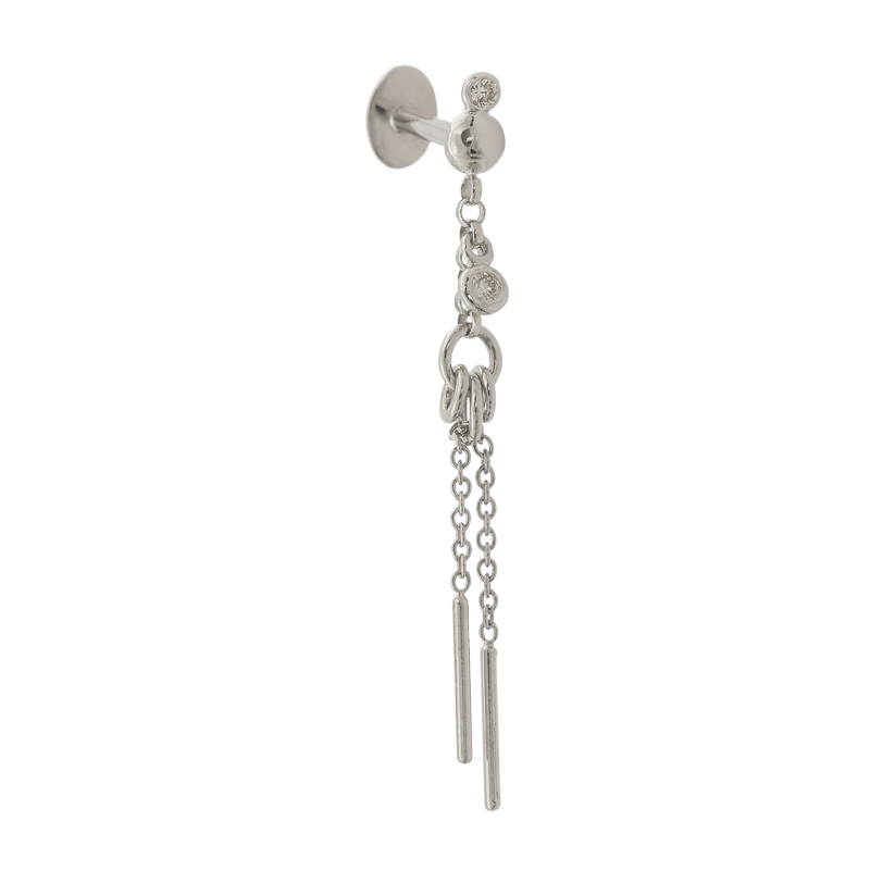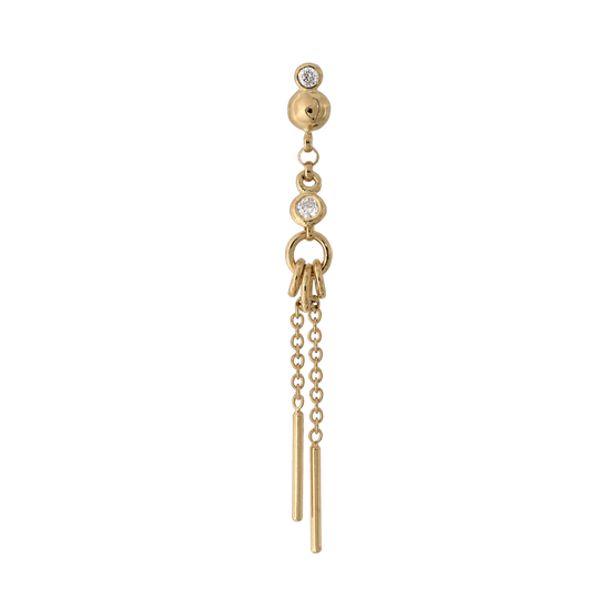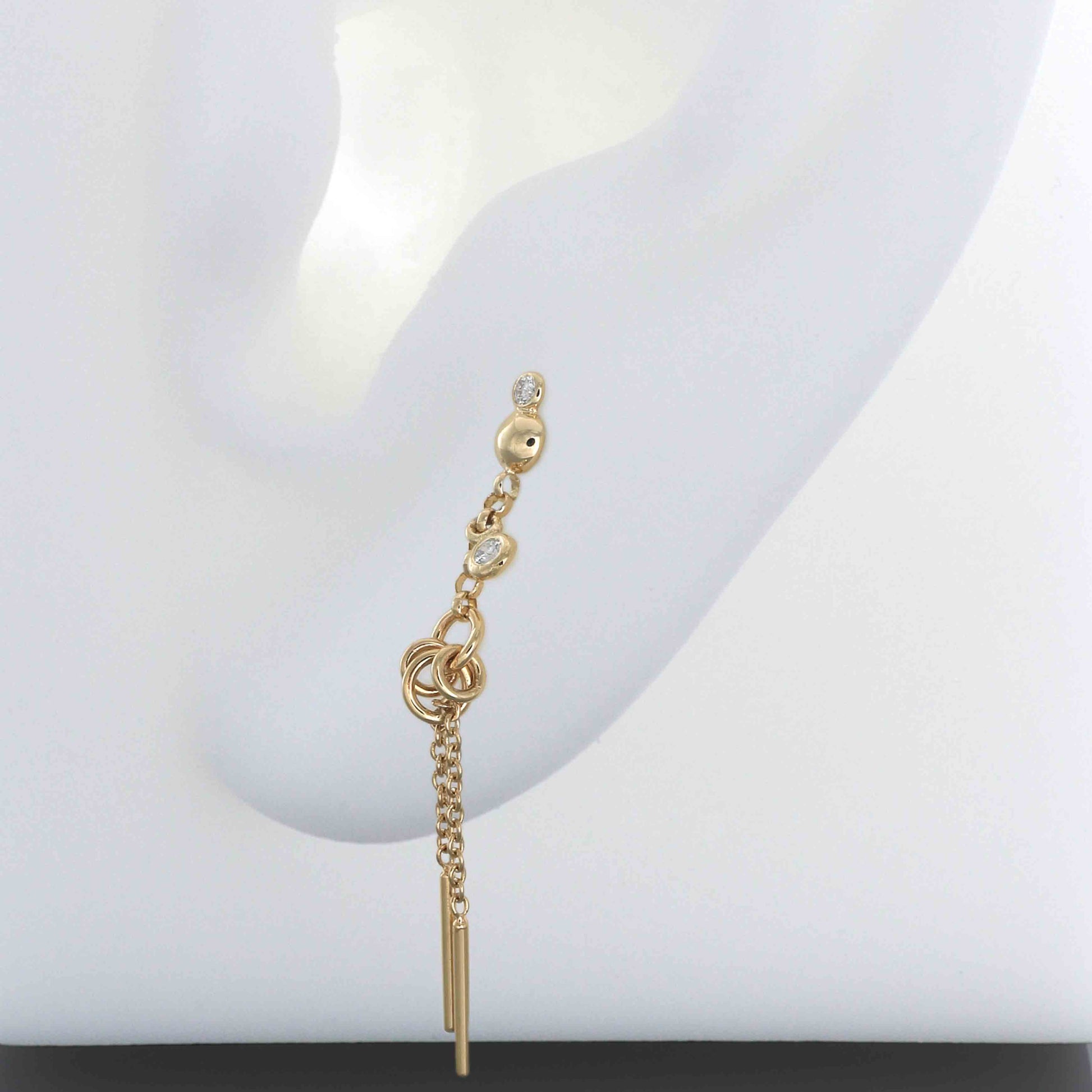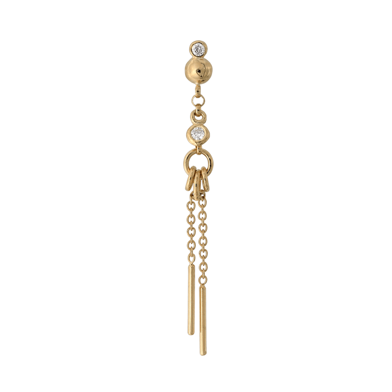 Size: 2.3mm x 29mm w/ dangle Material: solid 14k gold Gemstone: Faceted Round Diamond |