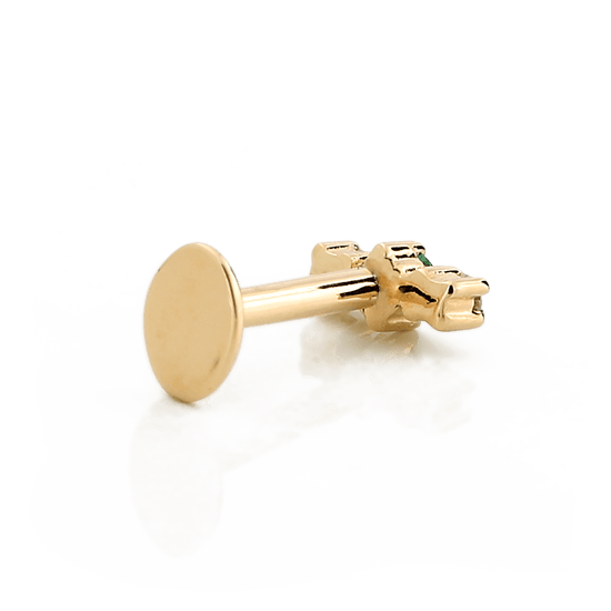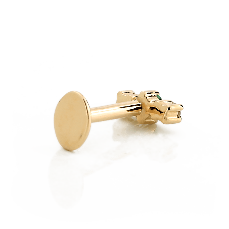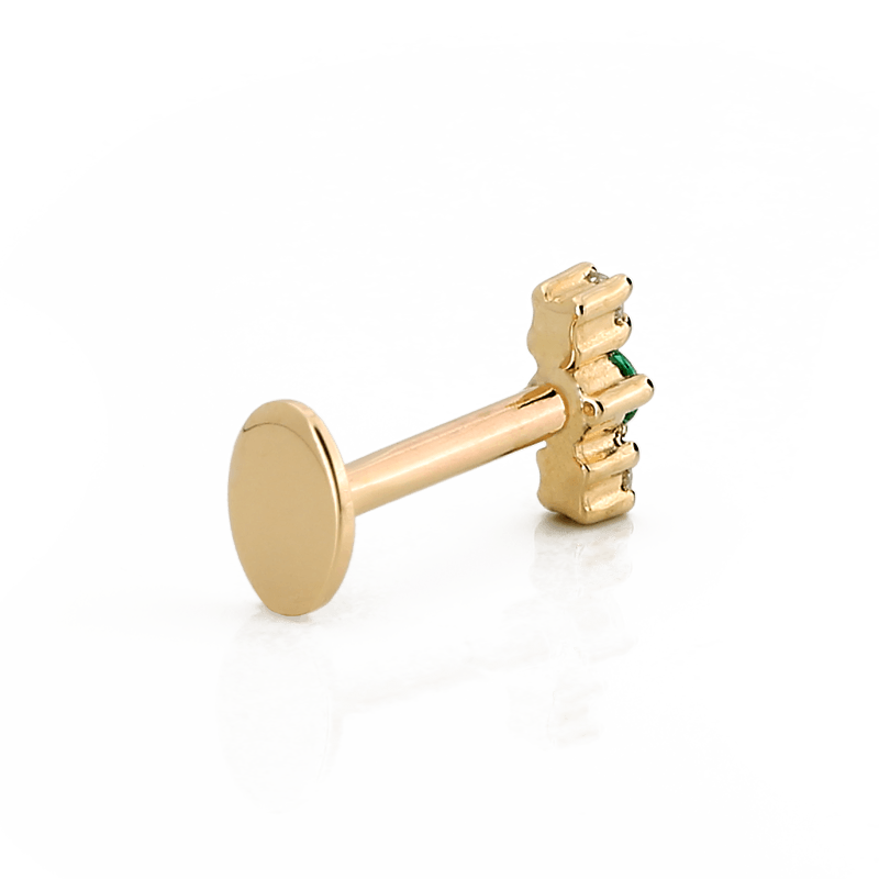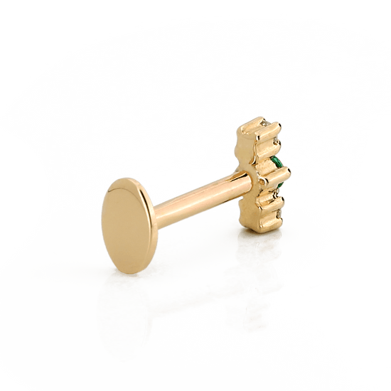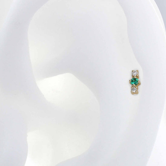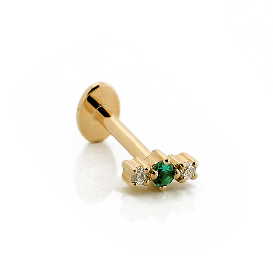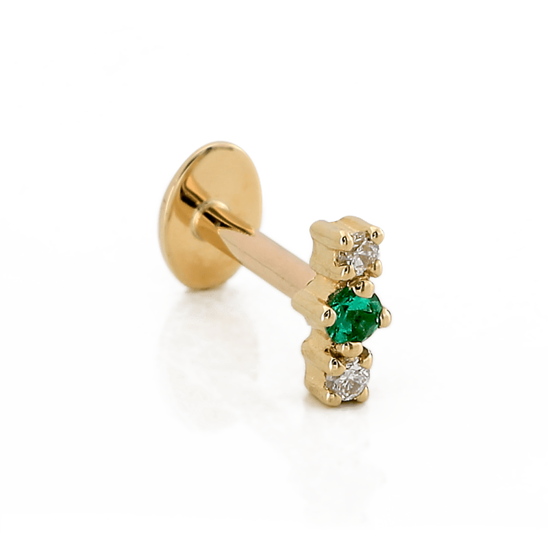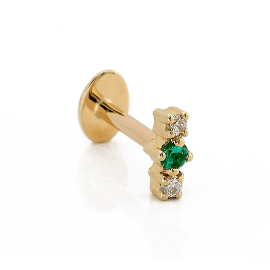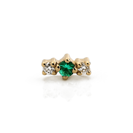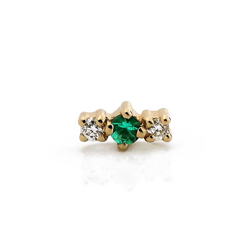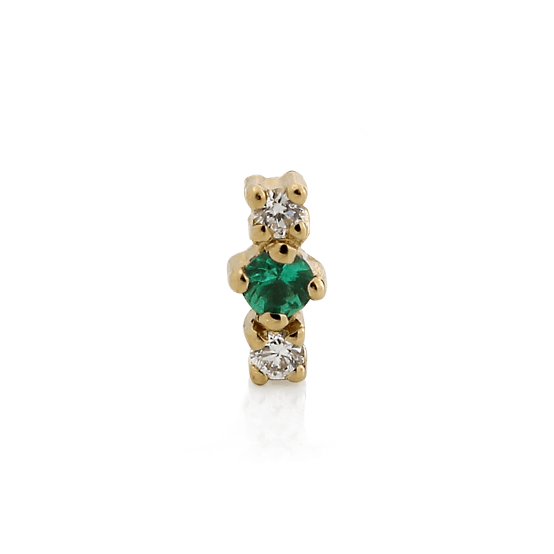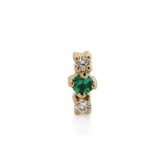 Size: 2mm x 4.7mm Material: 14k Gold Gemstone cut: Faceted Rounds - White Diamonds, Emerald |