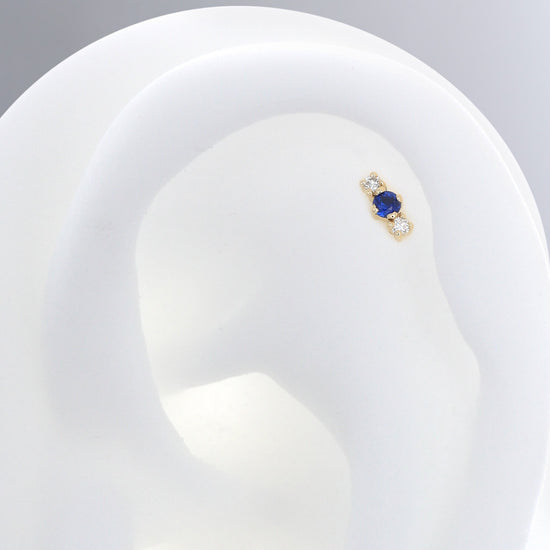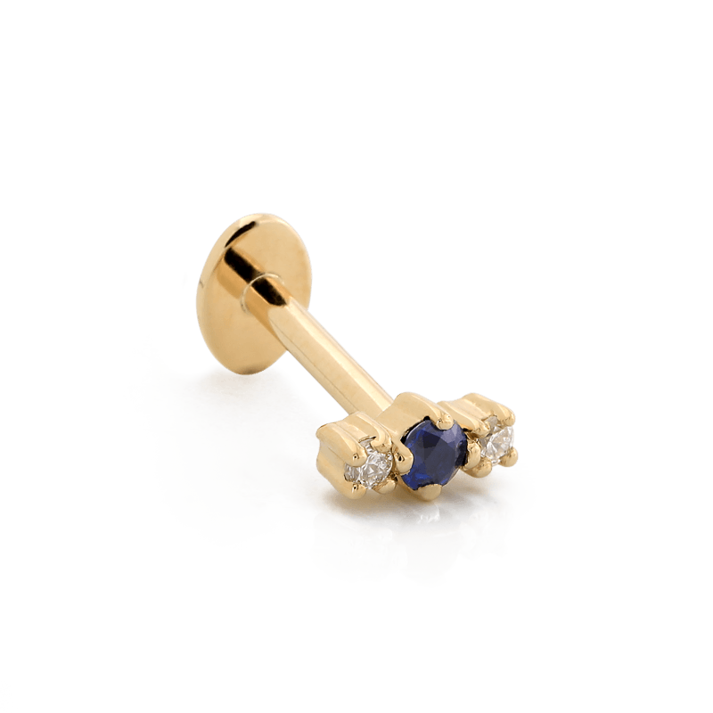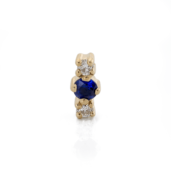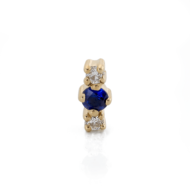 Size: 2mm x 4.7mm Material: 14k Gold Gemstone cut: Faceted Rounds - White Diamonds, Dark Blue Sapphire |