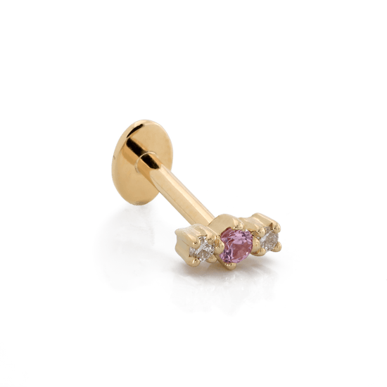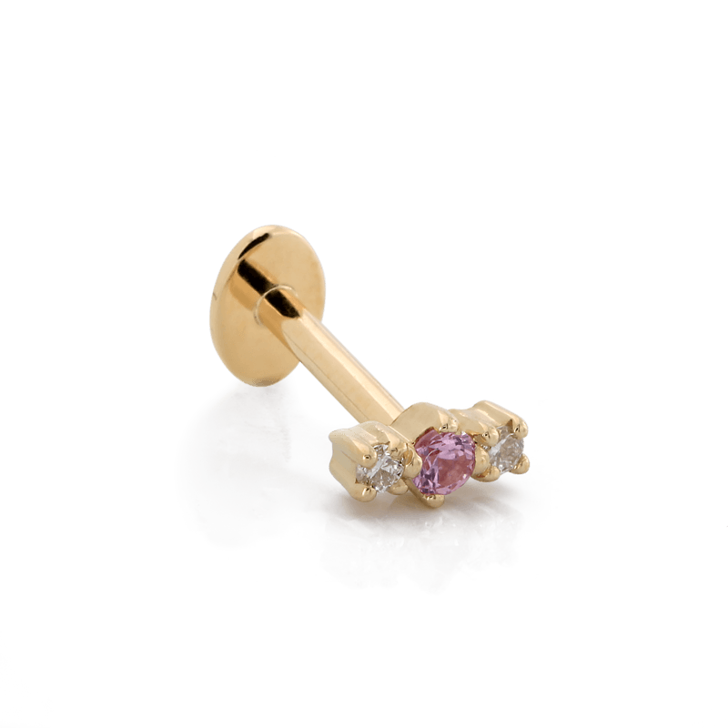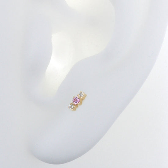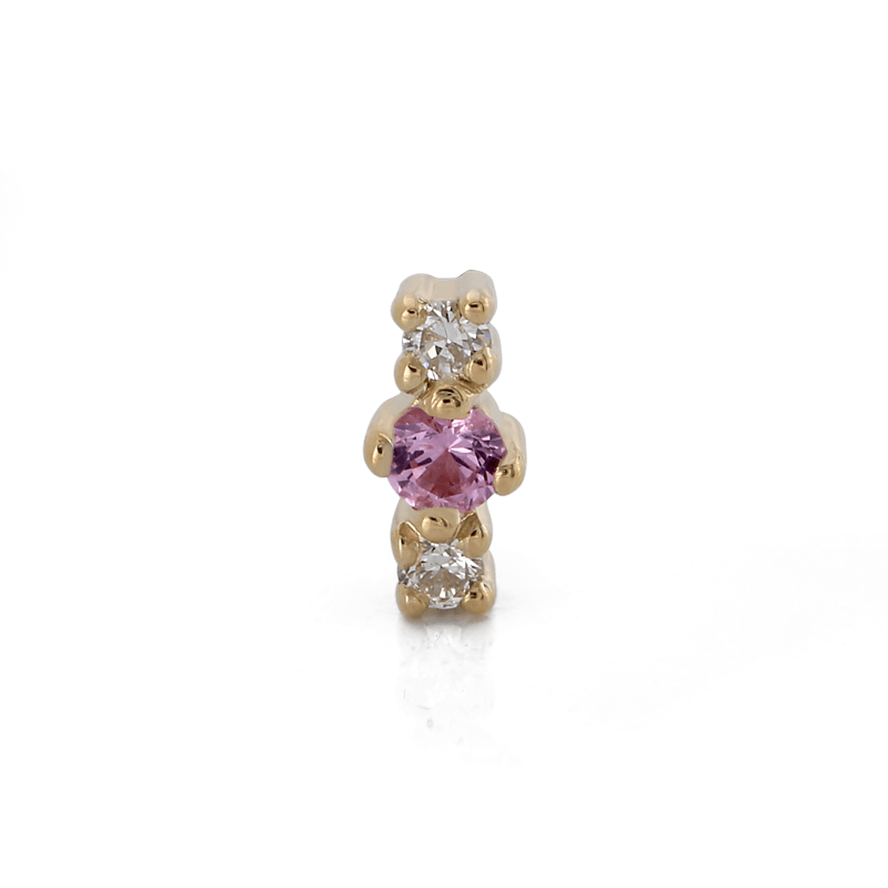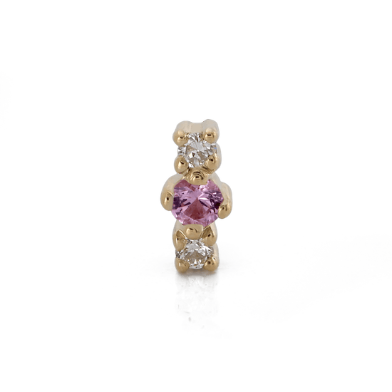 Size: 2mm x 4.7mm Material: 14k Gold Gemstone cut: Faceted Rounds - White Diamonds, Pink Sapphire |