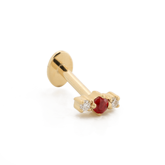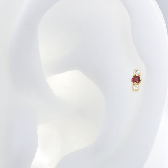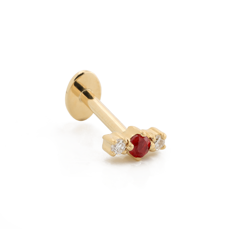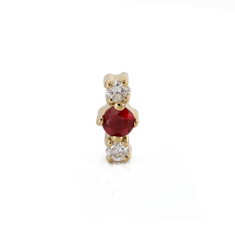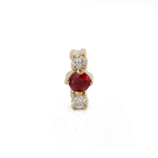 Size: 2mm x 4.7mm Material: 14k Gold Gemstone cut: Faceted Rounds - White Diamonds, Ruby |
