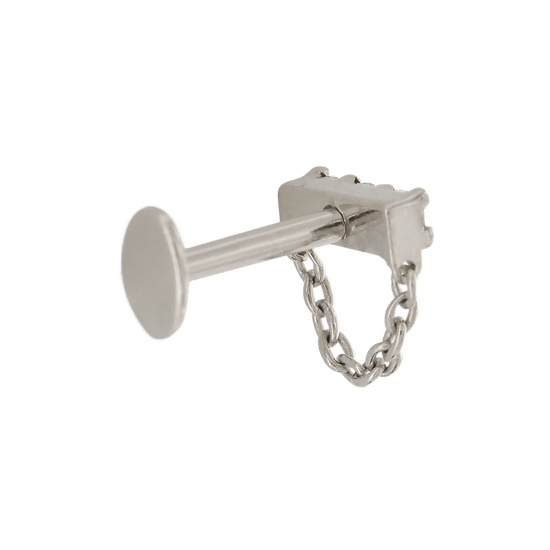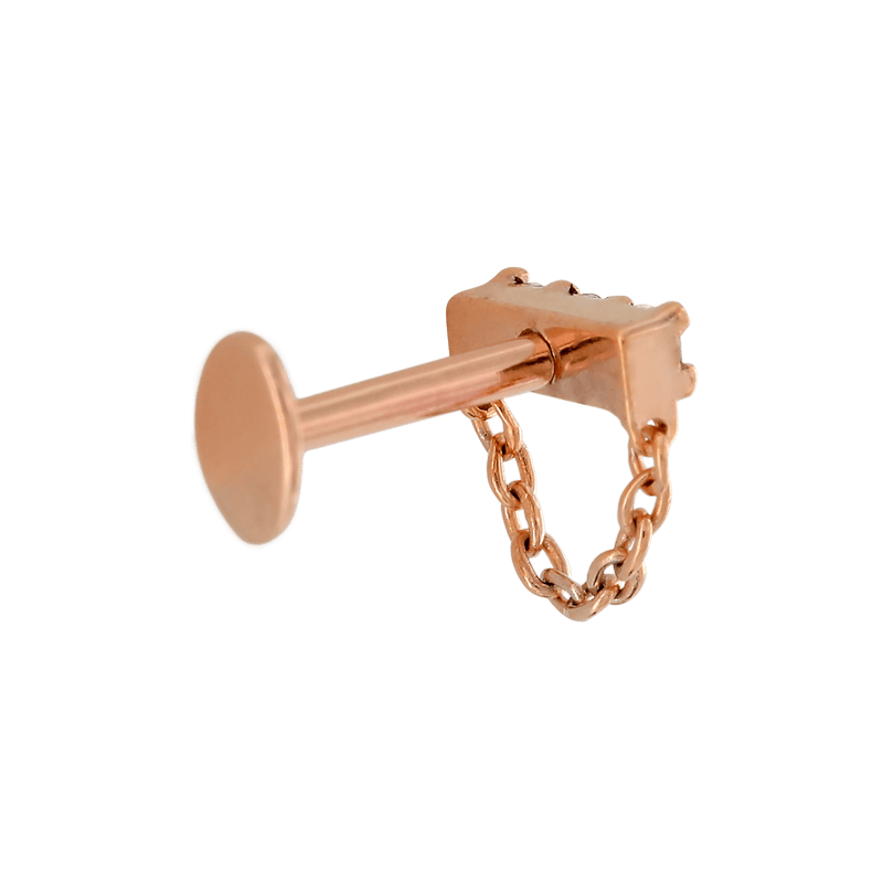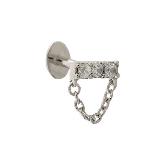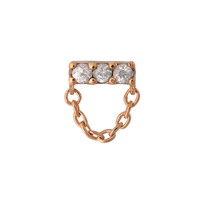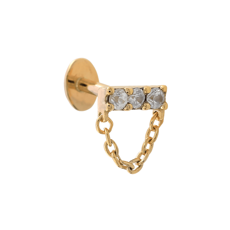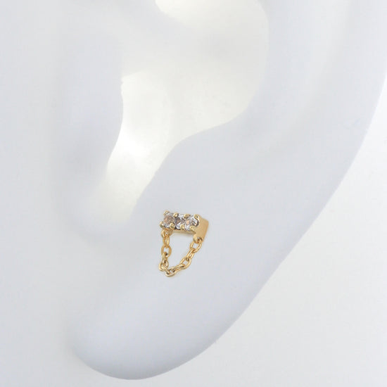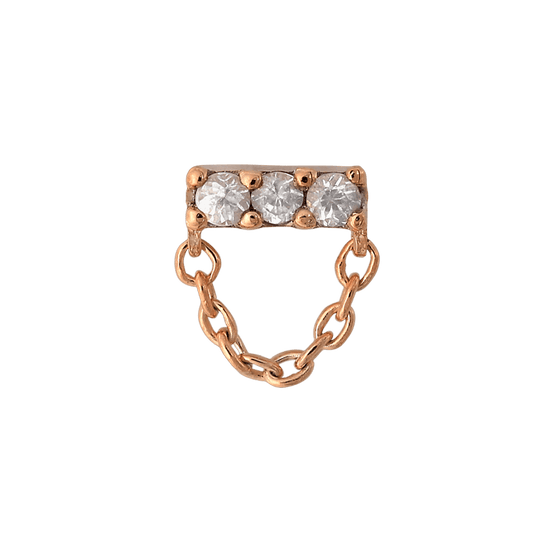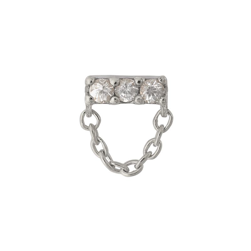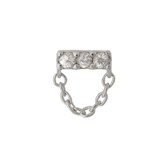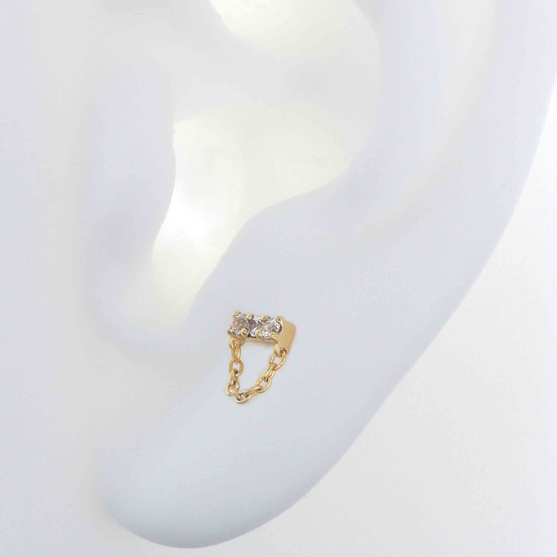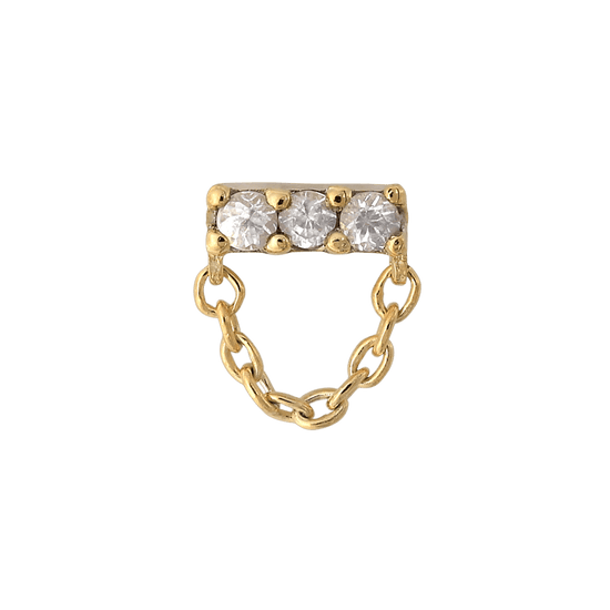 Size: 1.5mm x 5.2mm, 7mm w/ chain Material: solid 14k gold Gemstone: Faceted Round White Sapphires |