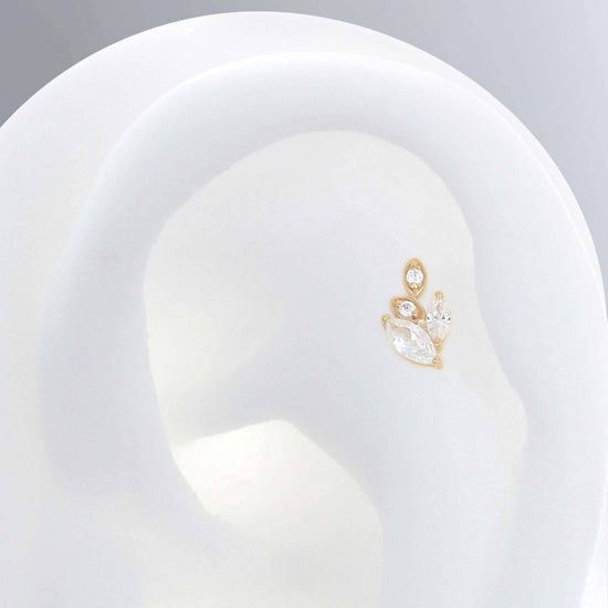 A beautiful cluster in gold with two marquise stones and two round stones in a marquise shaped setting.