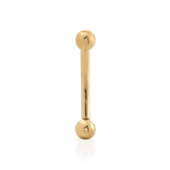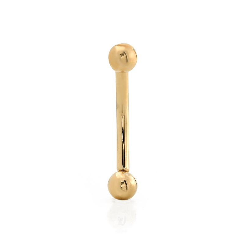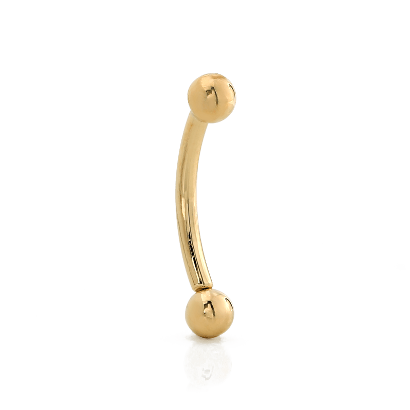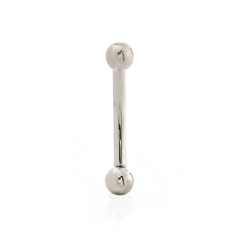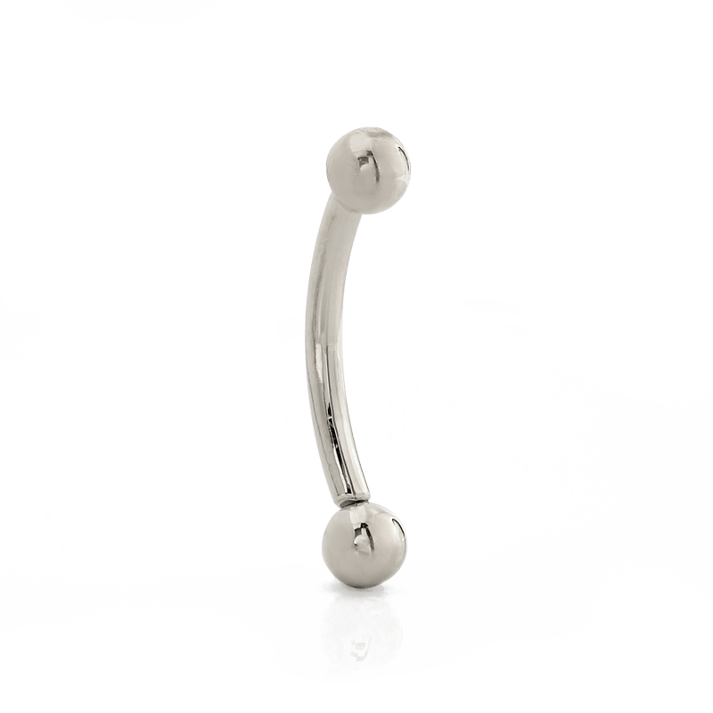 This threadless curved barbell features a 3/32" fixed ball on one end and a removable threadless 3/32" ball on the other end. |