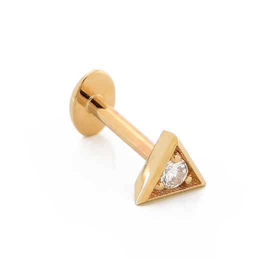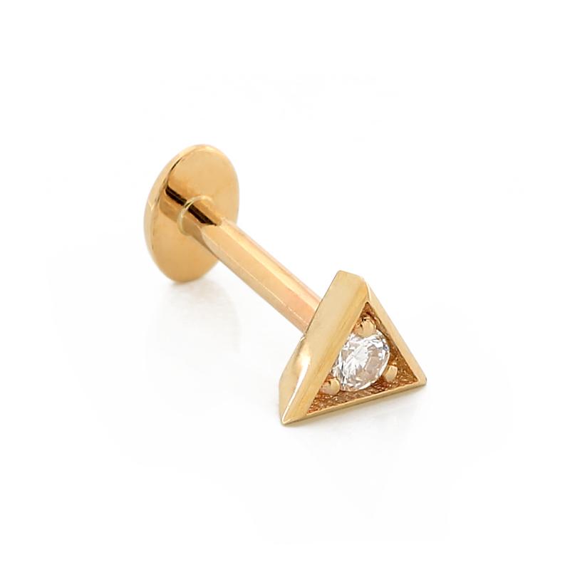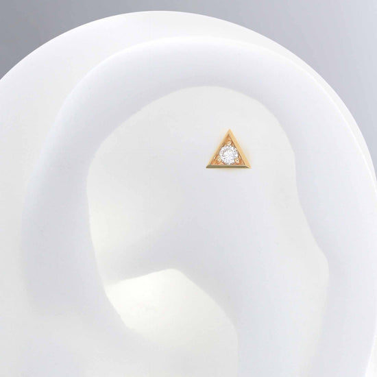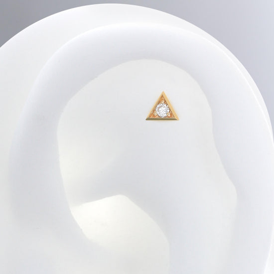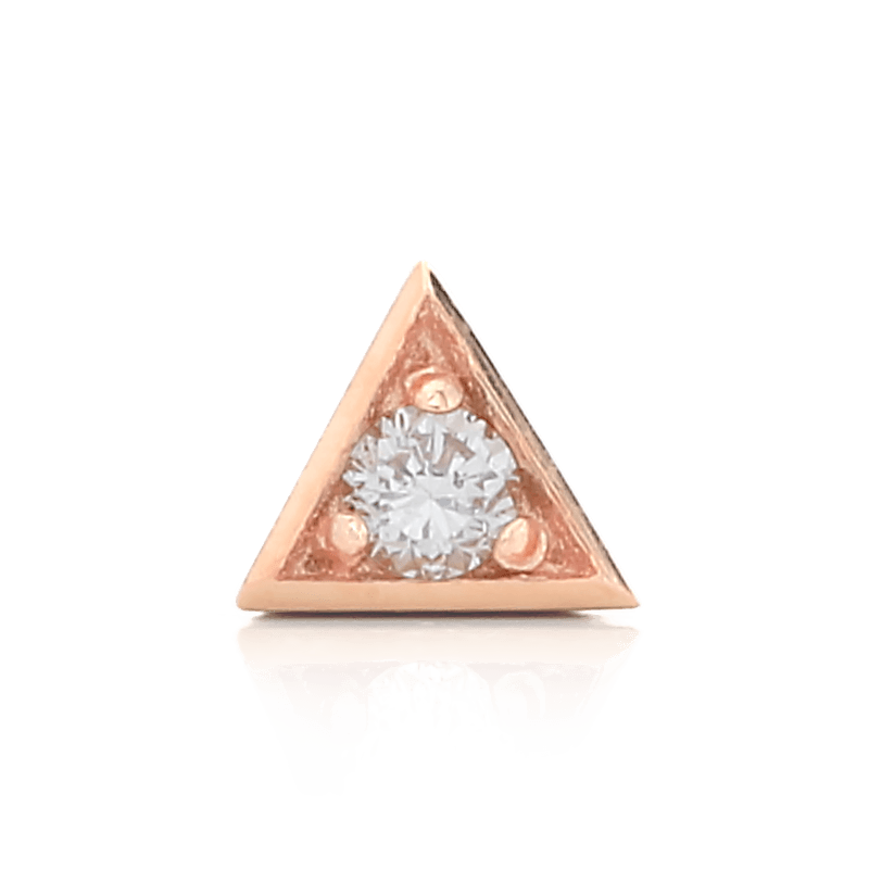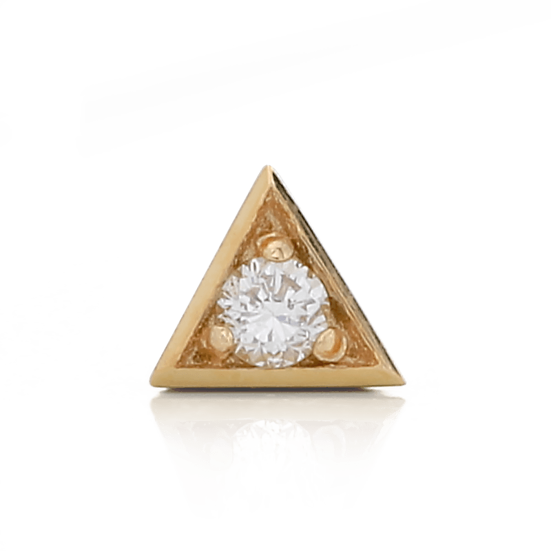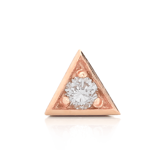 A beautiful prong set genuine diamond in a solid 14k gold triangular shape.