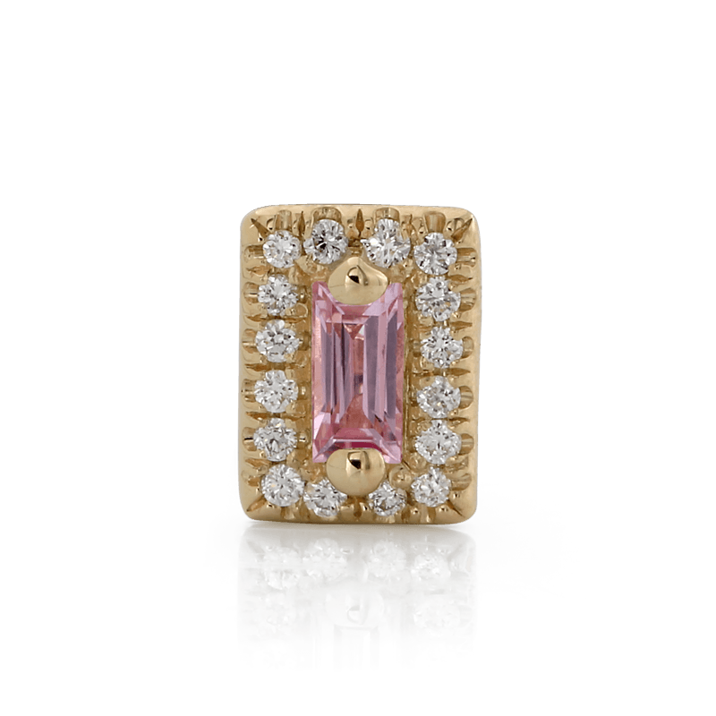 Size: 4mm x 5.4mm Material: 14k Gold Gemstone cut: Faceted Baguette & Faceted Rounds - White Diamonds, Pink Sapphire |
