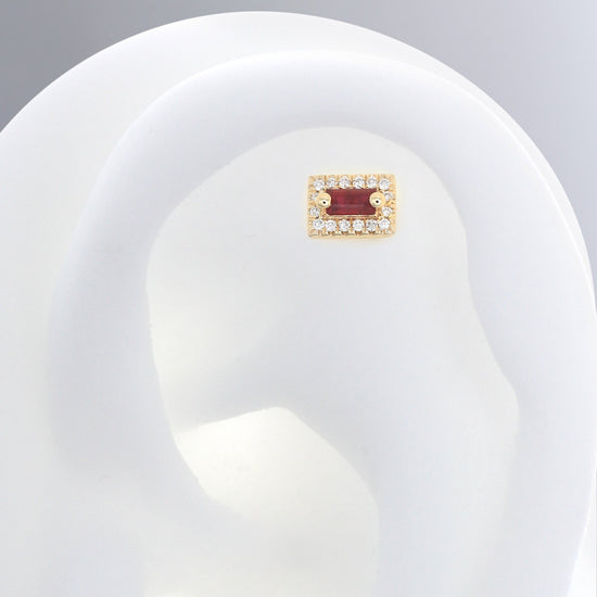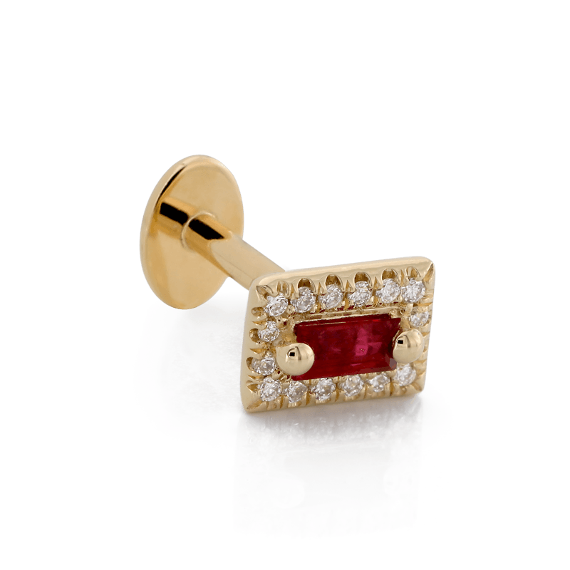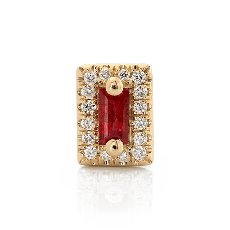 Size: 4mm x 5.4mm Material: 14k Gold Gemstone cut: Faceted Baguette & Faceted Rounds - White Diamonds, Ruby |