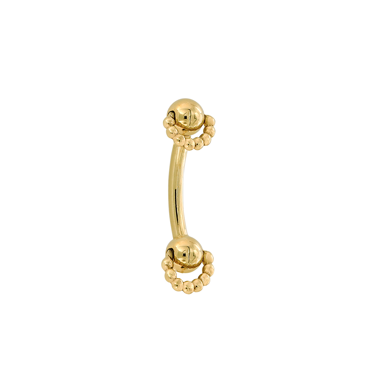 This threadless curved barbell features a 3/32" fixed ball with a knocker full of beads on one end and a removable threadless 3/32" ball with a knocker full of beads on the other end. |