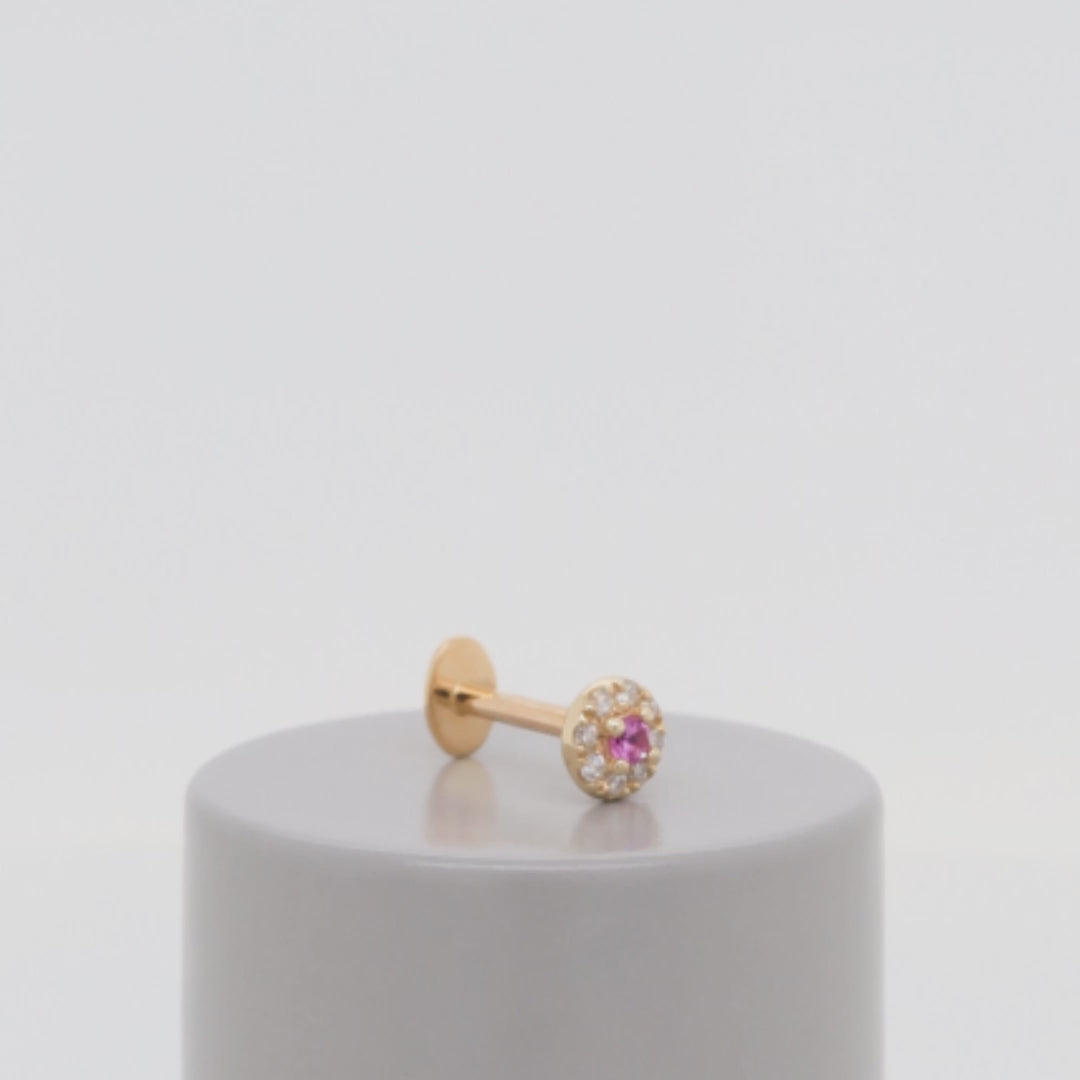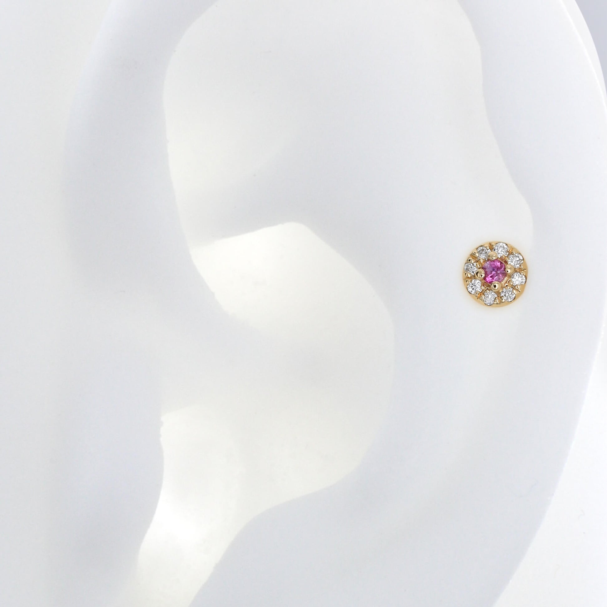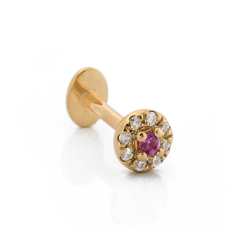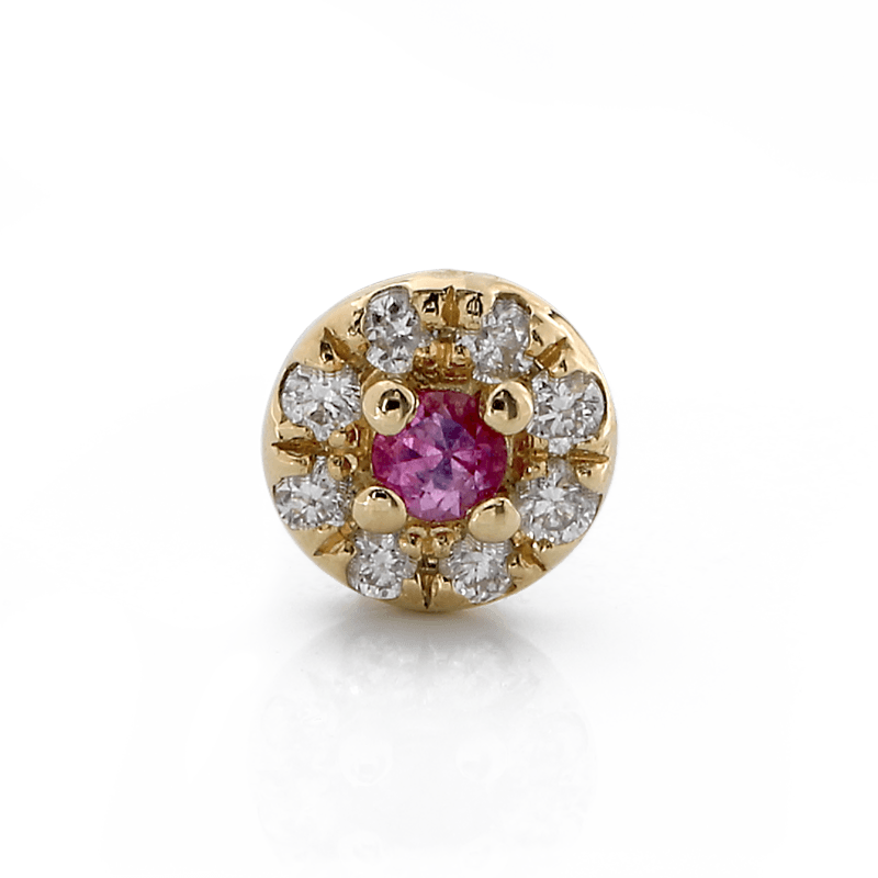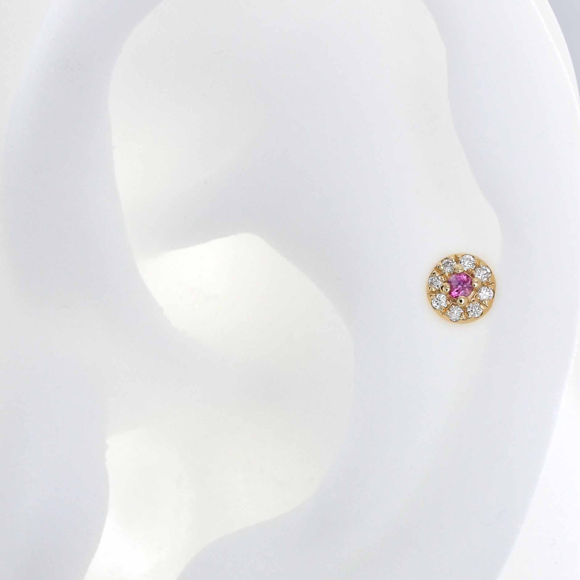 Size: 3.8mm Material: 14k Gold Gemstone cut: Faceted Rounds - White Diamonds, Pink Sapphire |