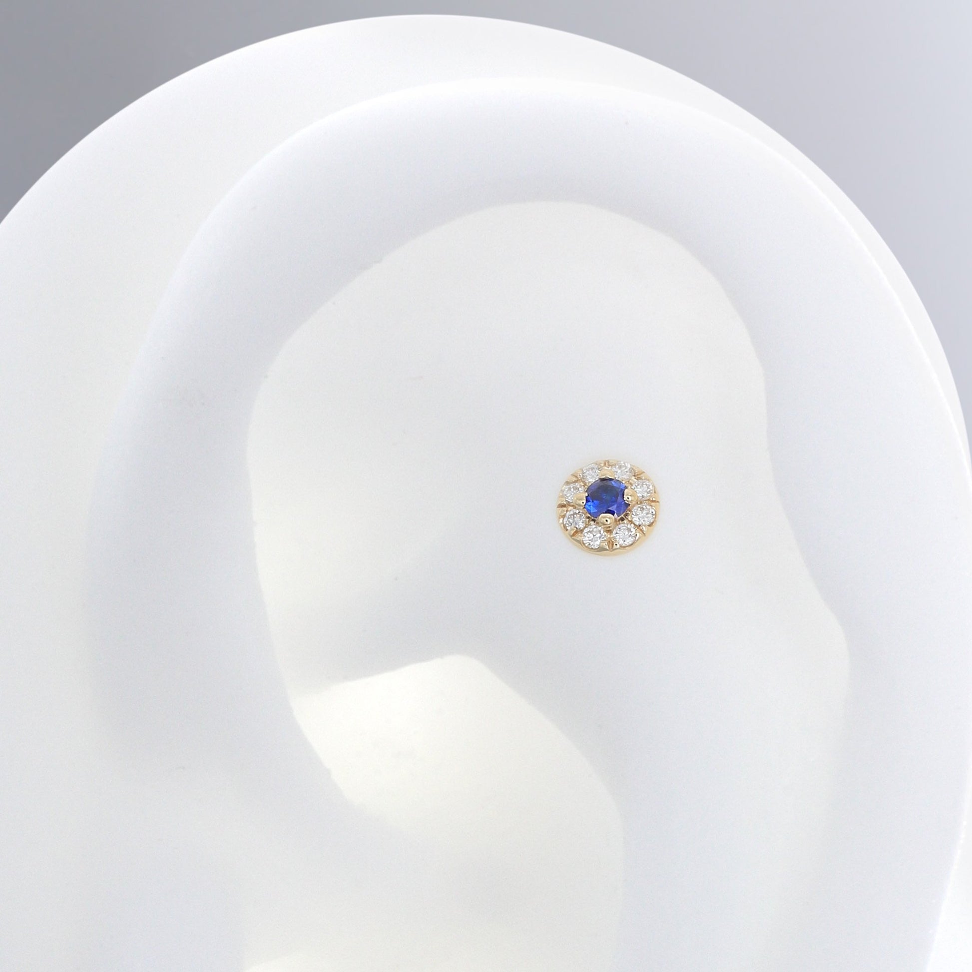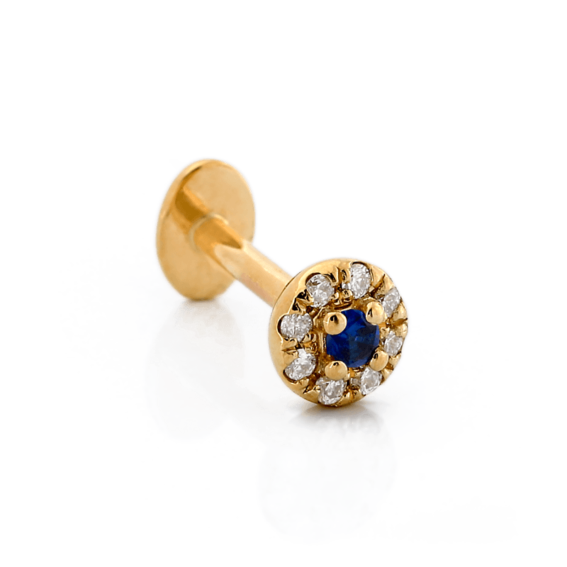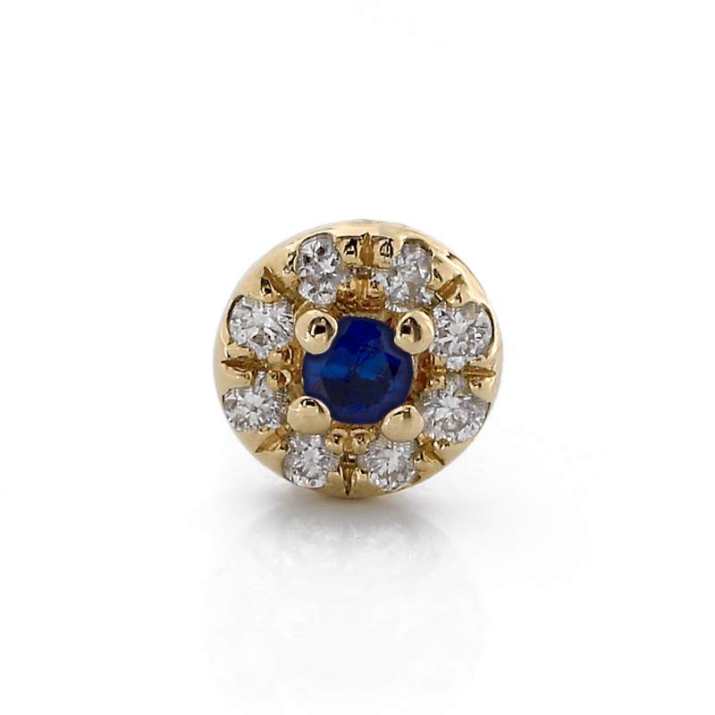 Size: 3.8mm Material: 14k Gold Gemstone cut: Faceted Rounds - White Diamonds, Dark Blue Sapphire |