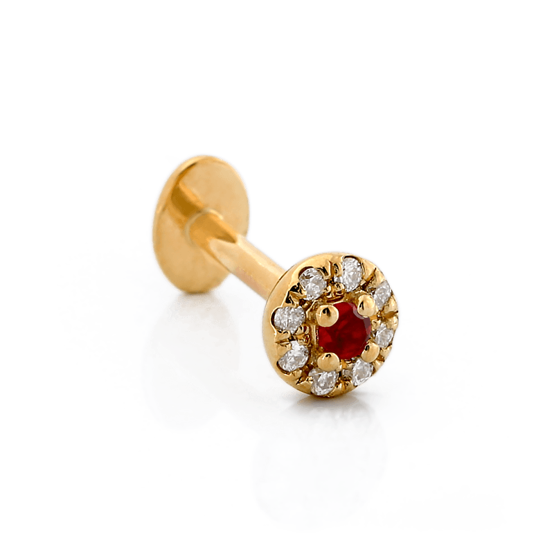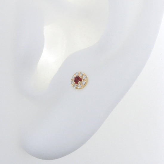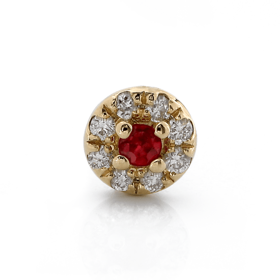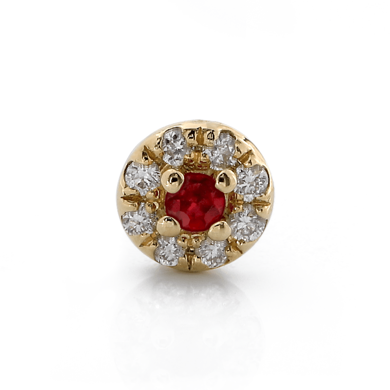 Size: 3.8mm Material: 14k Gold Gemstone cut: Faceted Rounds - White Diamonds, Ruby |