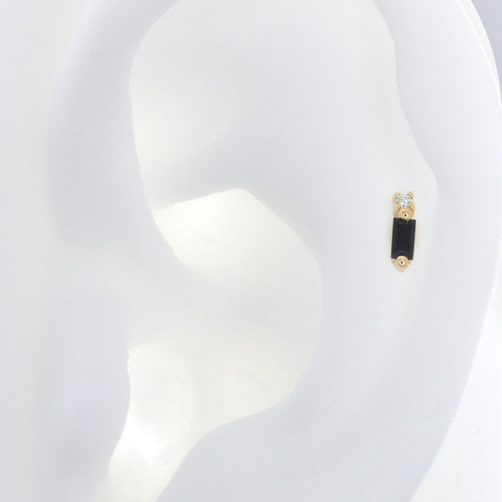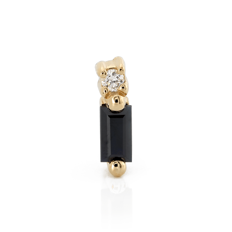 Size: 1.6mm x 5.8mm Material: 14k Gold Gemstone cut: Faceted Baguette & Faceted Round - White Diamond, Black Sapphire |