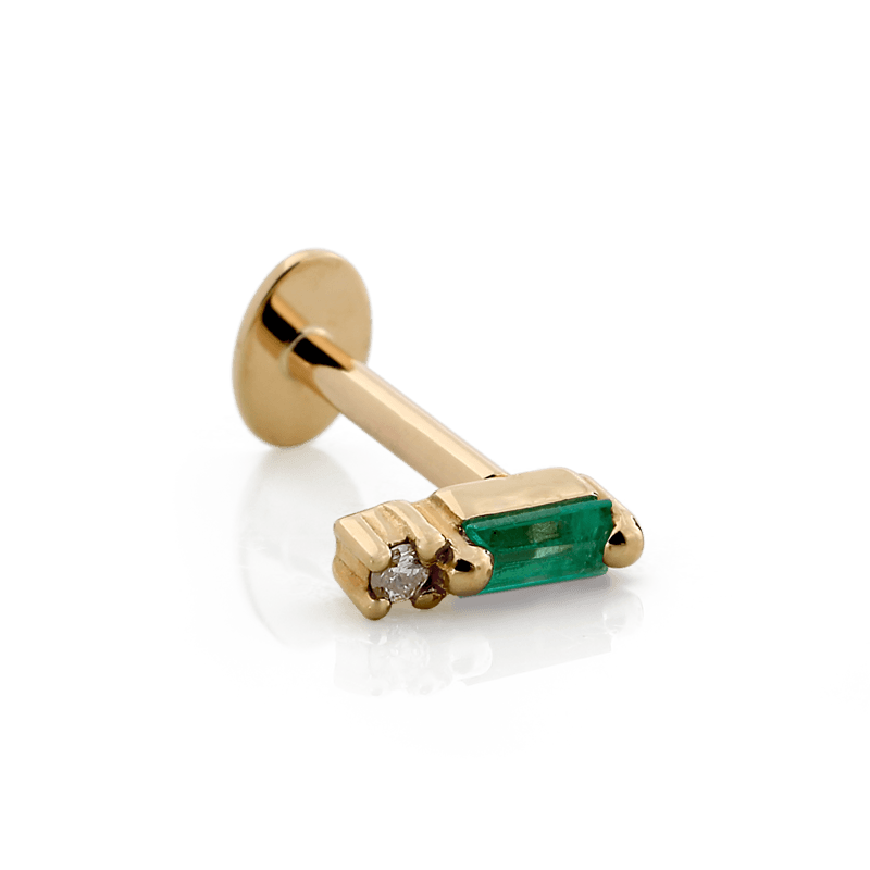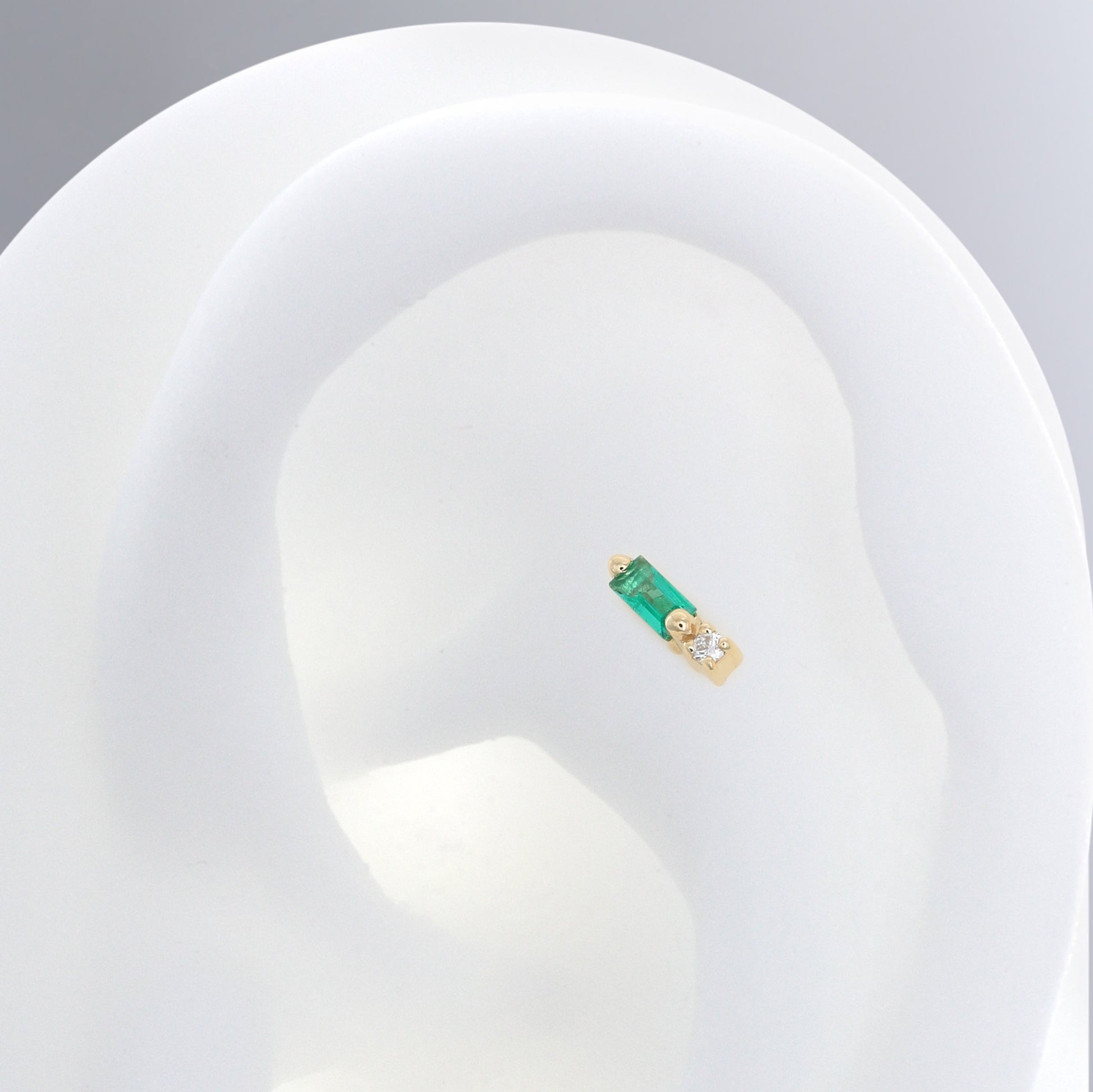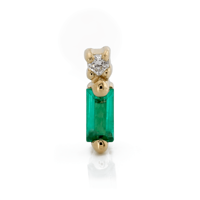 Size: 1.6mm x 5.8mm Material: 14k Gold Gemstone cut: Faceted Baguette & Faceted Round - White Diamond, Emerald |