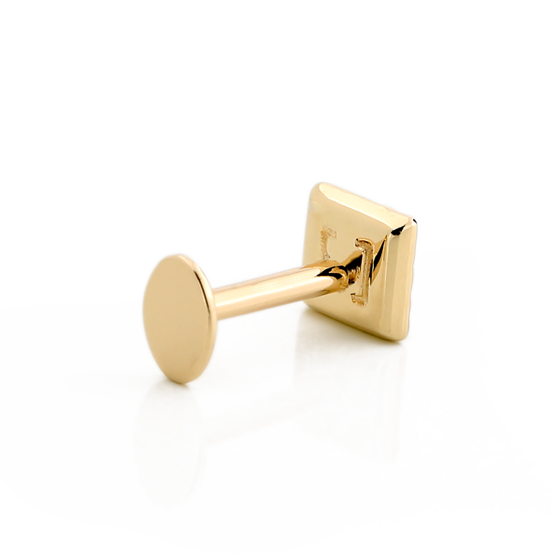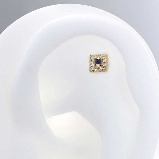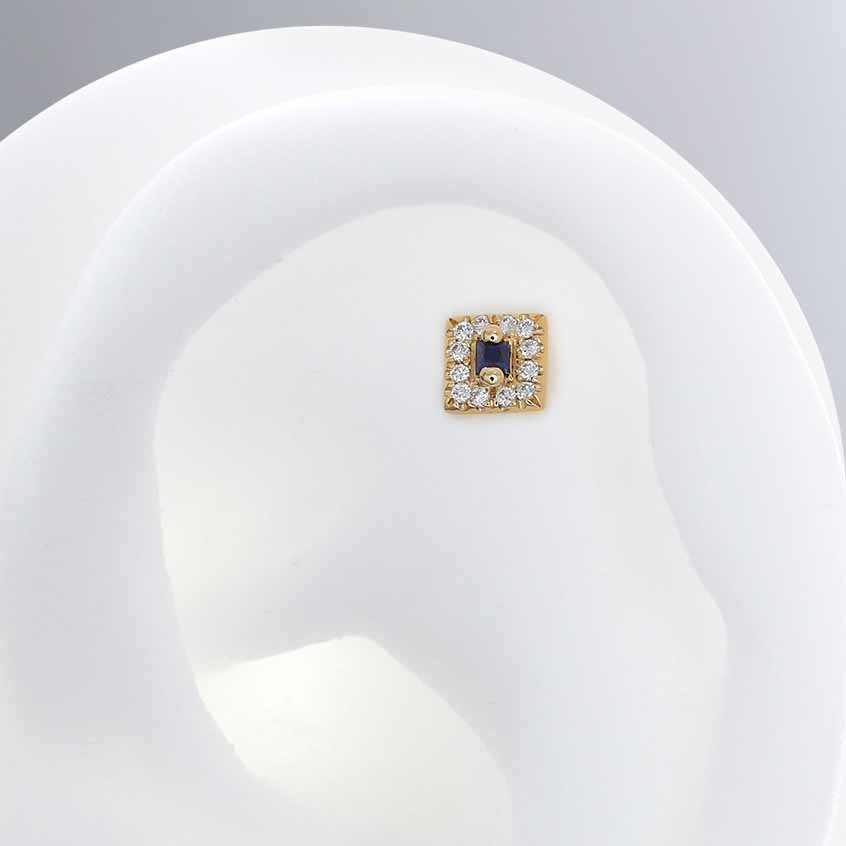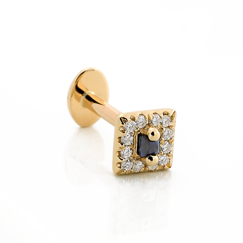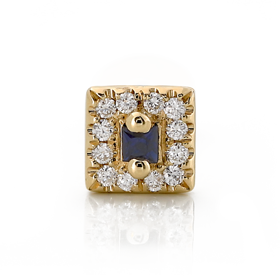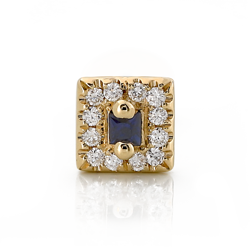 Size: 4mm x 4mm Material: 14k Gold Gemstone cut: 2mm Faceted Princess-cut & Faceted Rounds - White Diamonds, Dark Blue Sapphire |