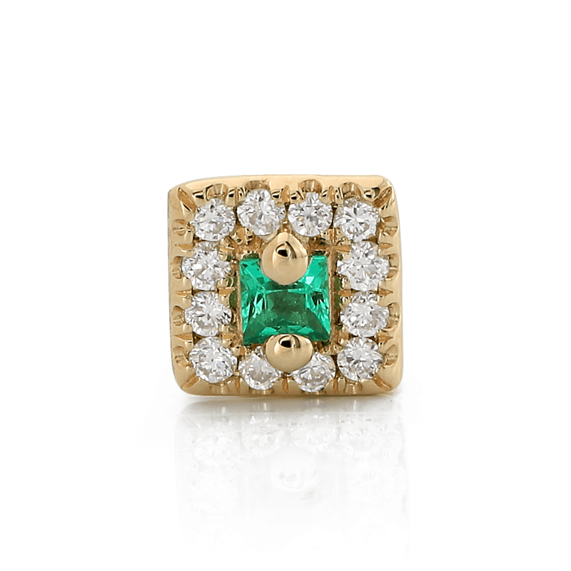 Size: 4mm x 4mm Material: 14k Gold Gemstone cut: Faceted 2mm Princess-cut & Faceted Rounds - White Diamonds, Emerald |