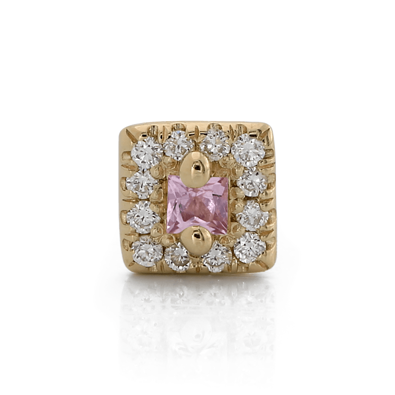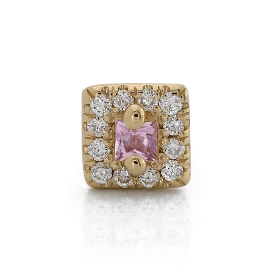 Size: 4mm x 4mm Material: 14k Gold Gemstone cut: Faceted 2mm Princess-cut & Faceted Rounds - White Diamonds, Pink Sapphire |