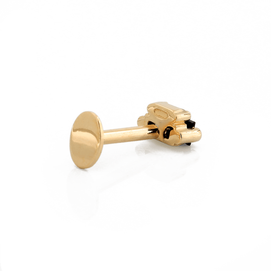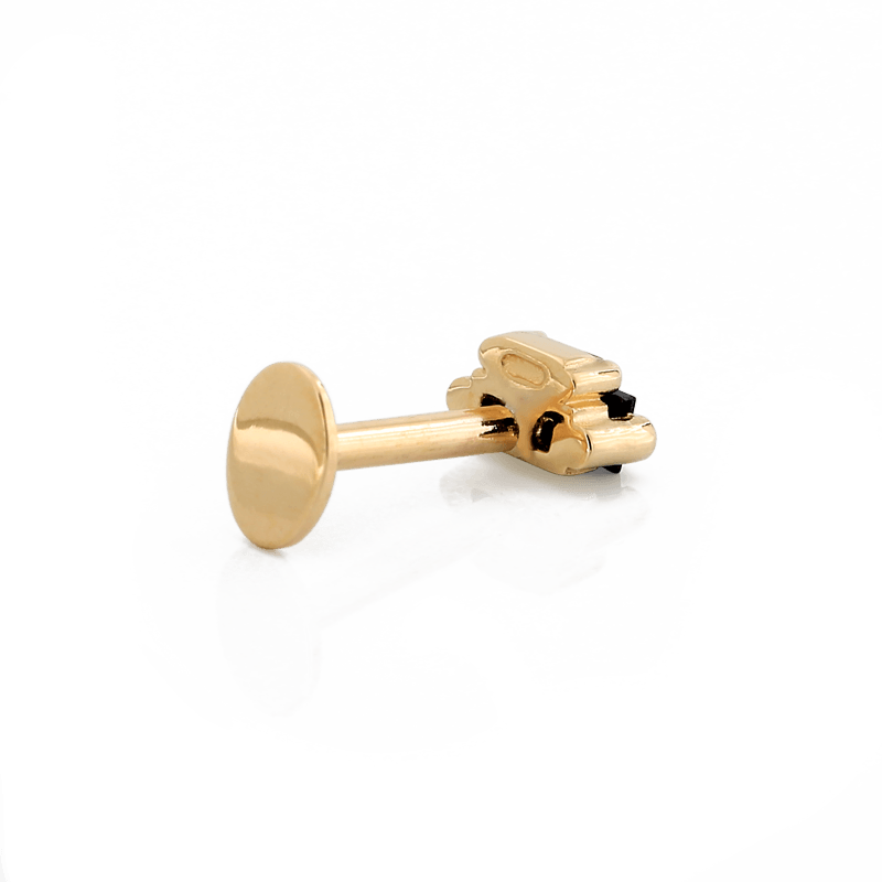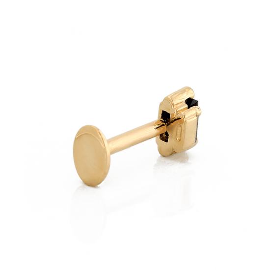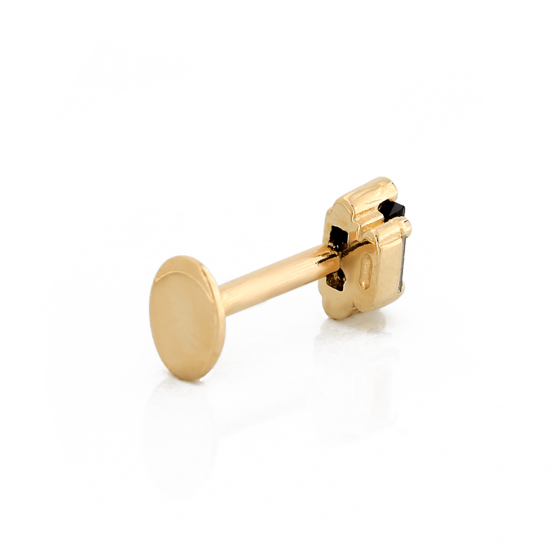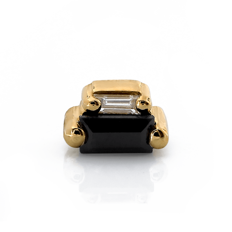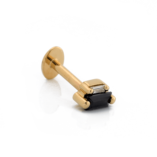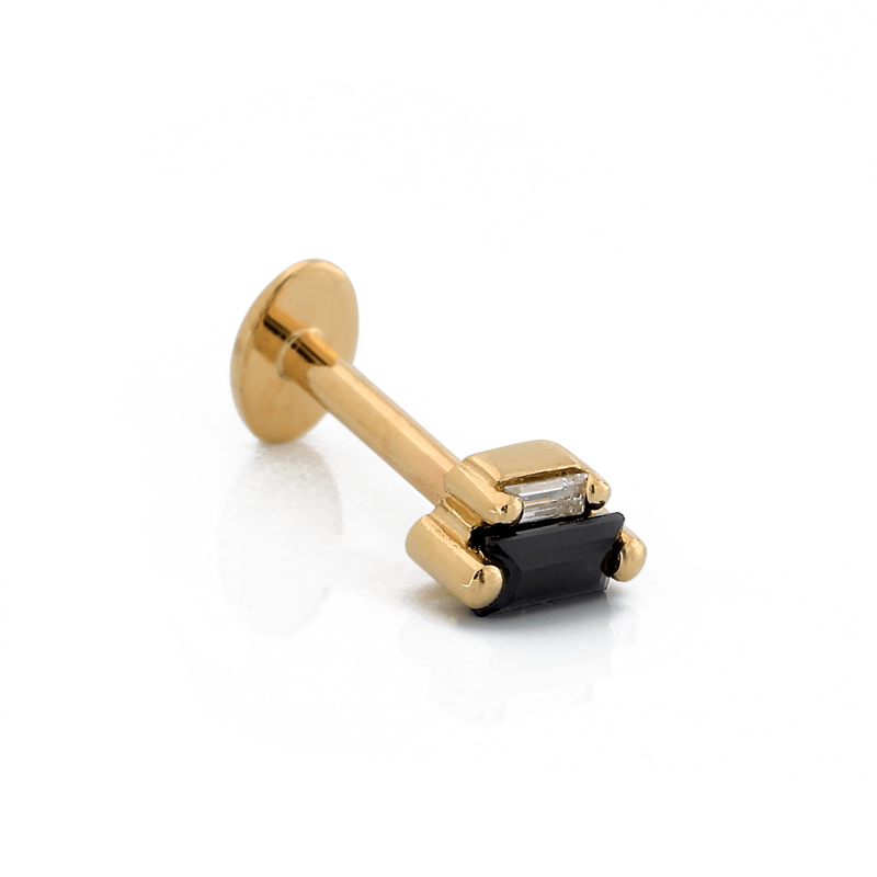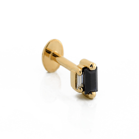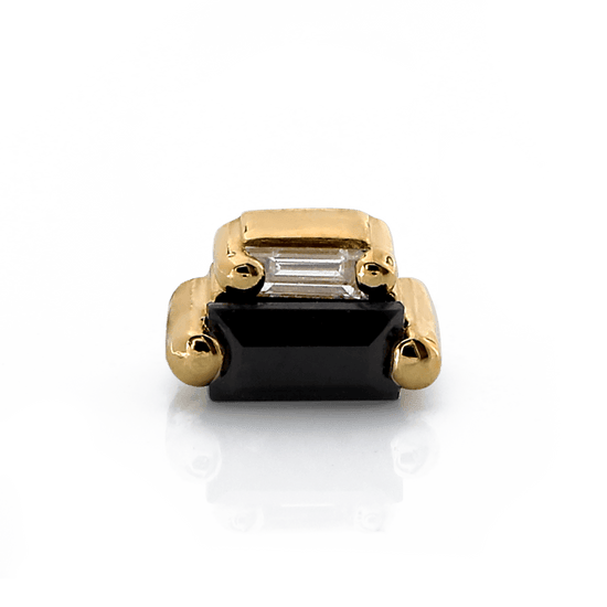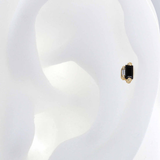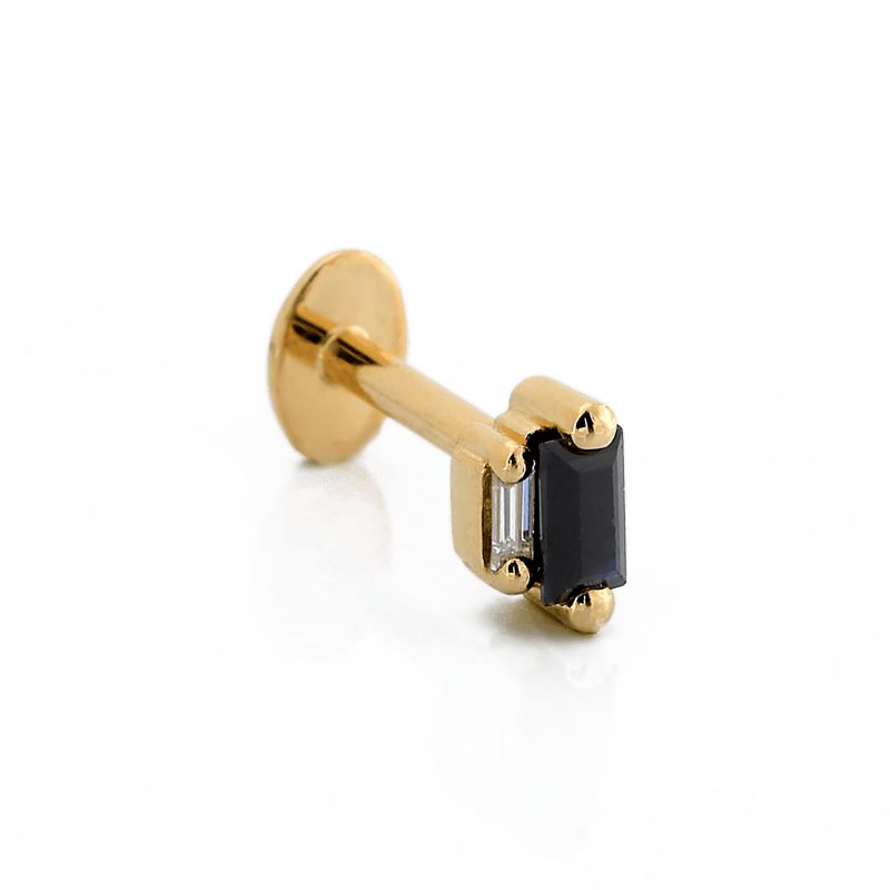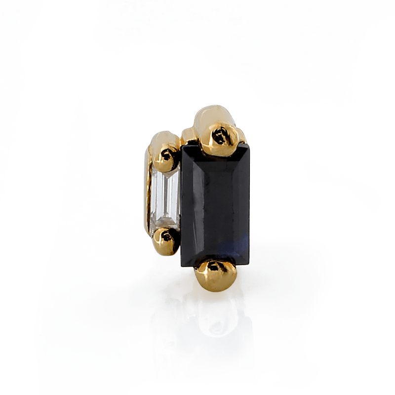 Size: 2.4mm x 4.2mm Material: 14k Gold Gemstone cut: Faceted Baguettes - Black Sapphire, Diamond |