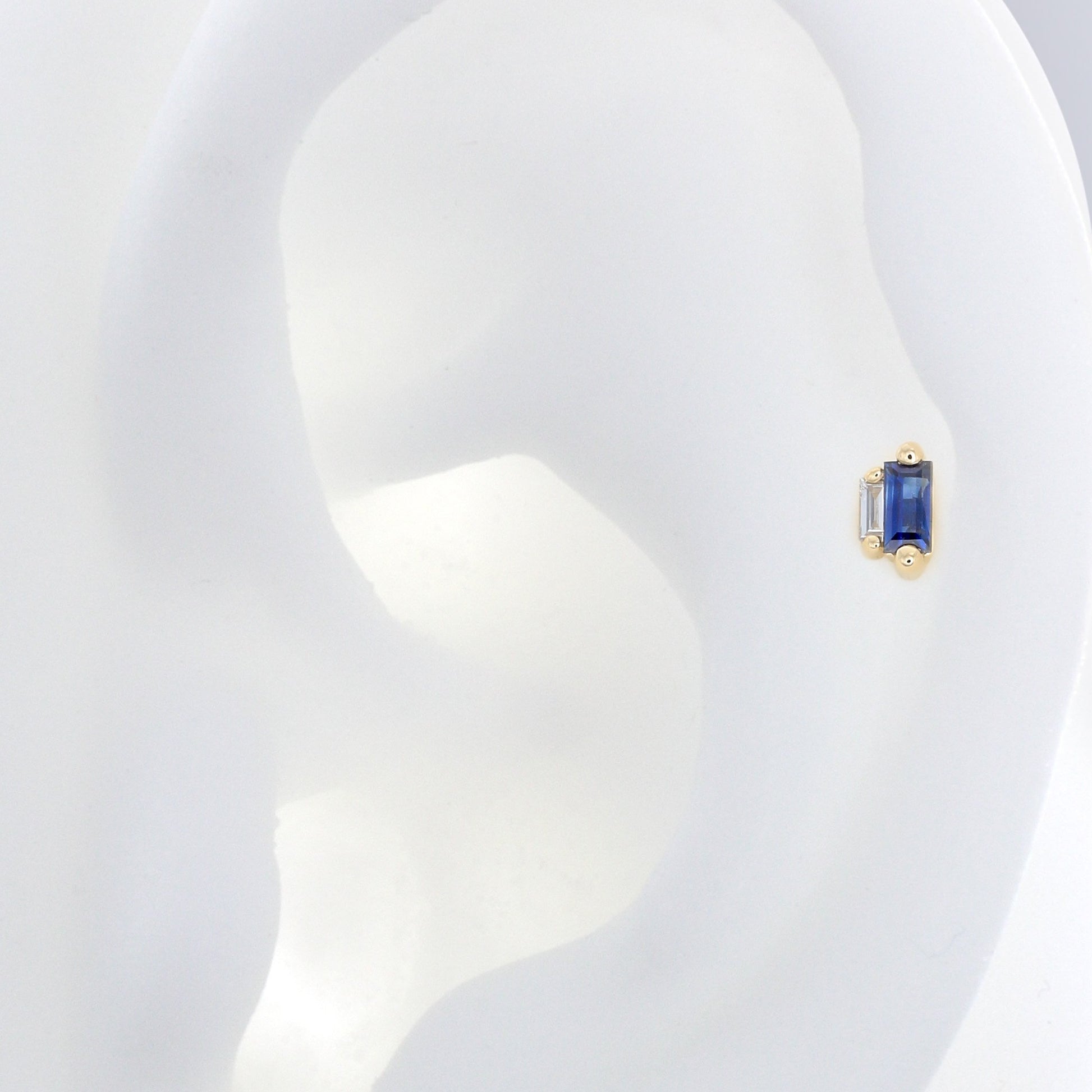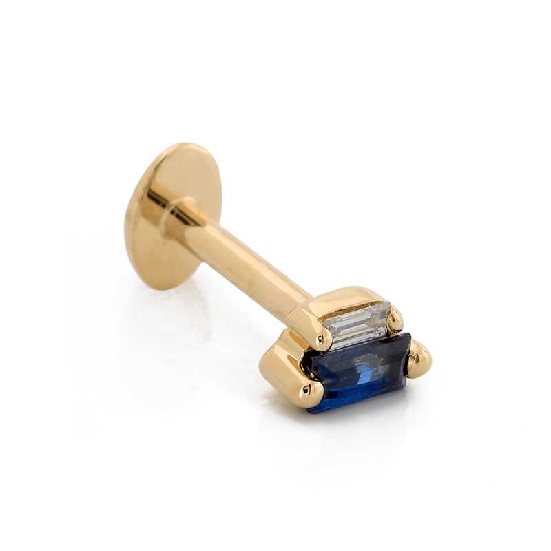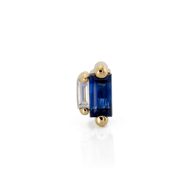 Size: 2.4mm x 4.2mm Material: 14k Gold Gemstone cut: Faceted Baguettes - Dark Blue Sapphire, Diamond |