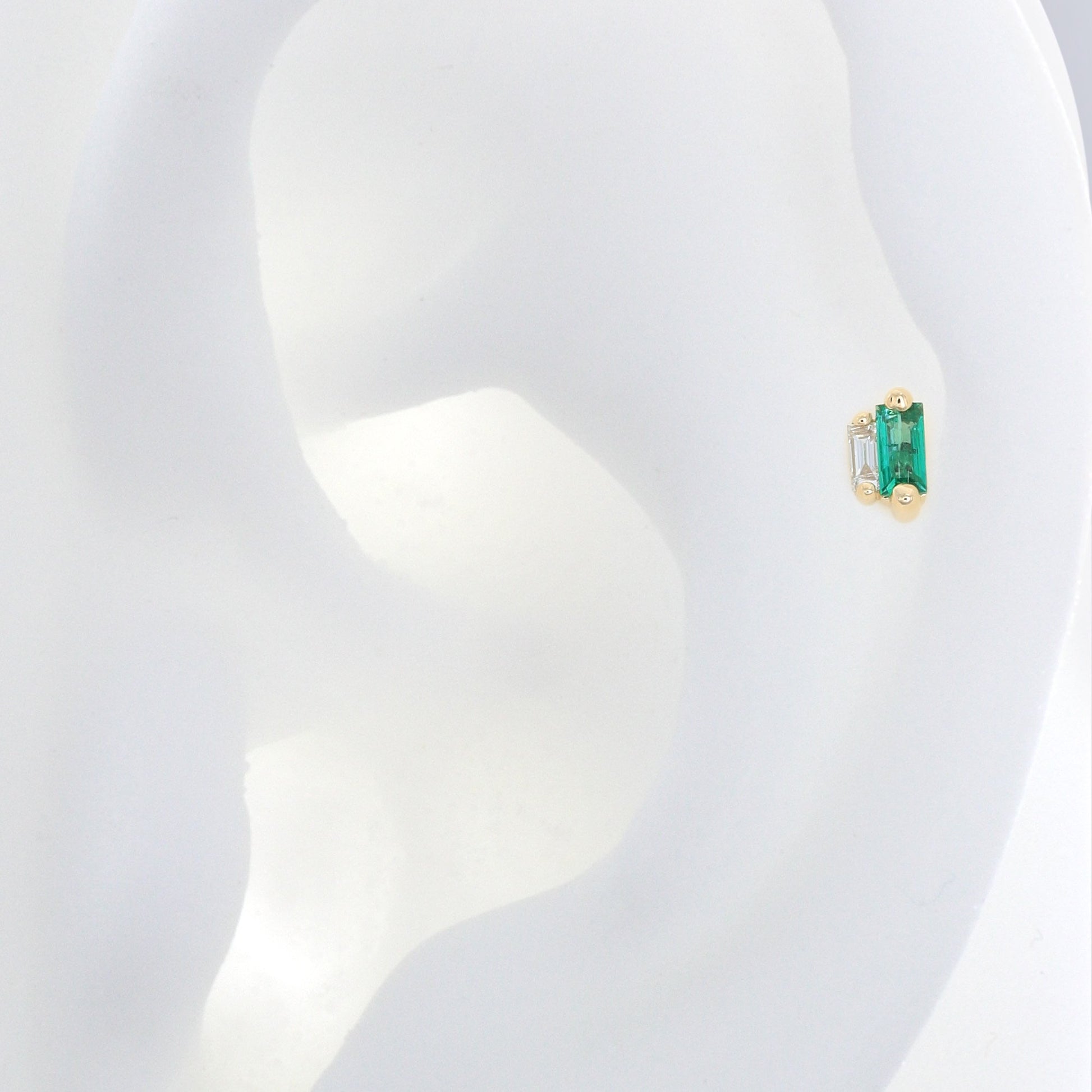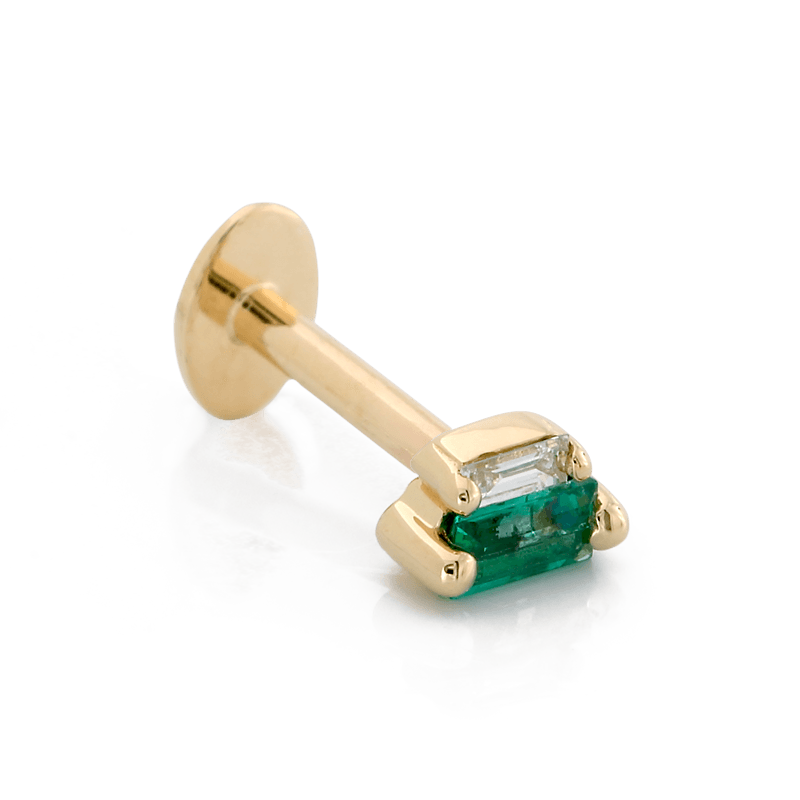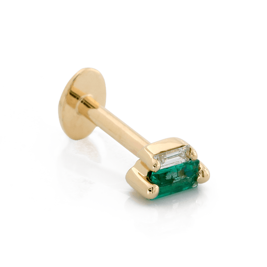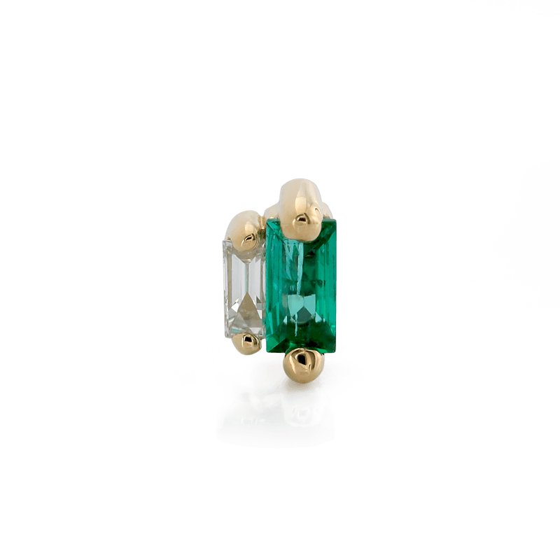 Size: 2.4mm x 4.2mm Material: 14k Gold Gemstone cut: Faceted Baguettes - Emerald, Diamond |