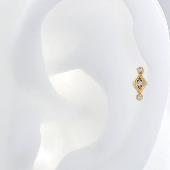 Size: 3.3mm x 7mm Material: solid 14k gold Gemstone: Faceted Round Diamonds x3 |